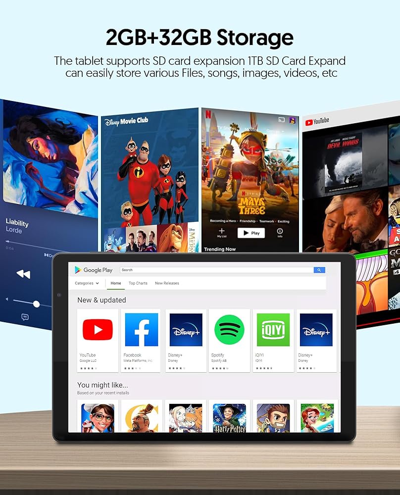 【Android 12 & High Performance CPU】10 inch tablet loaded with Android 12,features a high performance quad-core processor,delivering quick app launches,making your app run smoother. 4GB (2GB+2GB expansion) RAM+32GB ROM,can be expanded up to 1TB via TF card (not included), you can confidently store all your photos, videos and files without concerns.