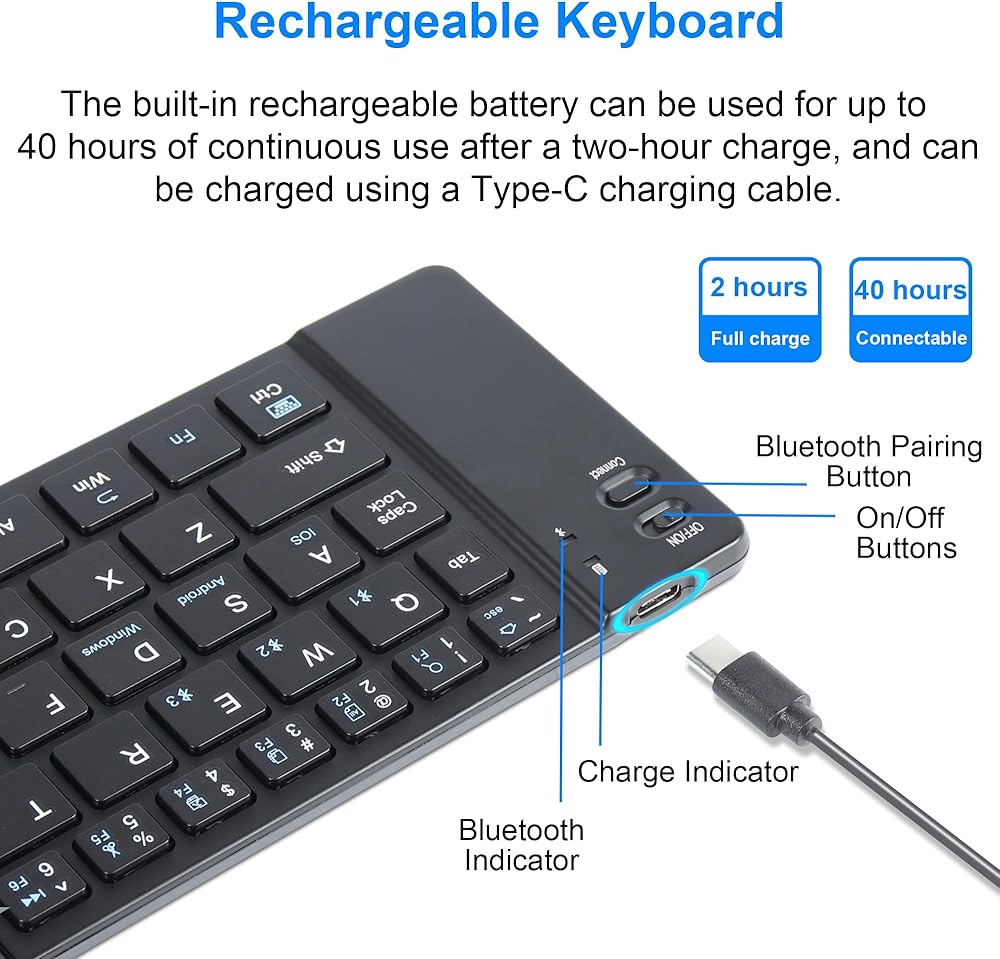 【Rechargeable Battery and Power Saving Function】This multi device keyboard has a built-in rechargeable battery, which can last up to 40 hours of continuous use after two hours of charging, and can be recharged using the charging cable. If the 66 Keys rechargeable keyboard is not used for 10 minutes, the pocket cordless keyboard will enter sleep mode to save power, press any key to wake up the folding keyboard bluetooth.