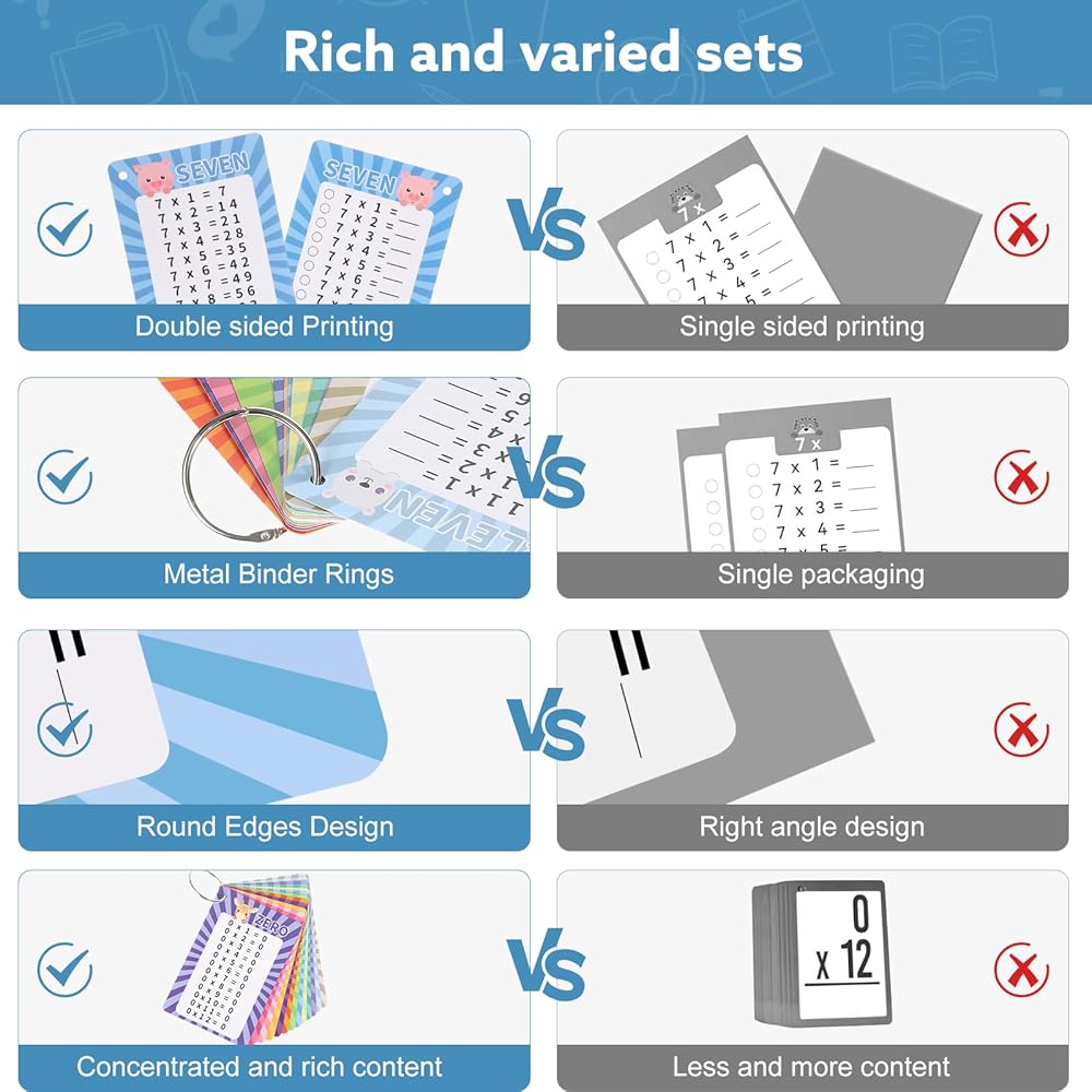 Pocket Size: Our multiplication flash cards are made of thickened cardboard, with a laminated design that is waterproof and won't fade, size is 5.9x3.93 inches/15x10 cm, and has a rounded edge design to avoid scratching. The binder rings can not only be stored and organized, but can also be hung on a school bag, making it easy to carry and study at any time.