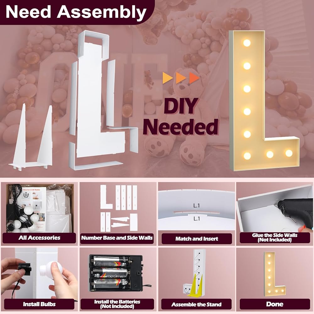【EASY TO SETUP】Marquee light up letters are pre-cut, all you needed was a glue gun to make it happen! Follow the instruction and video, and take 10-30 minutes max. Fill in corresponding color balloons, flowers, push-up lights, or artificial plants matching your party theme or marquee numbers.
