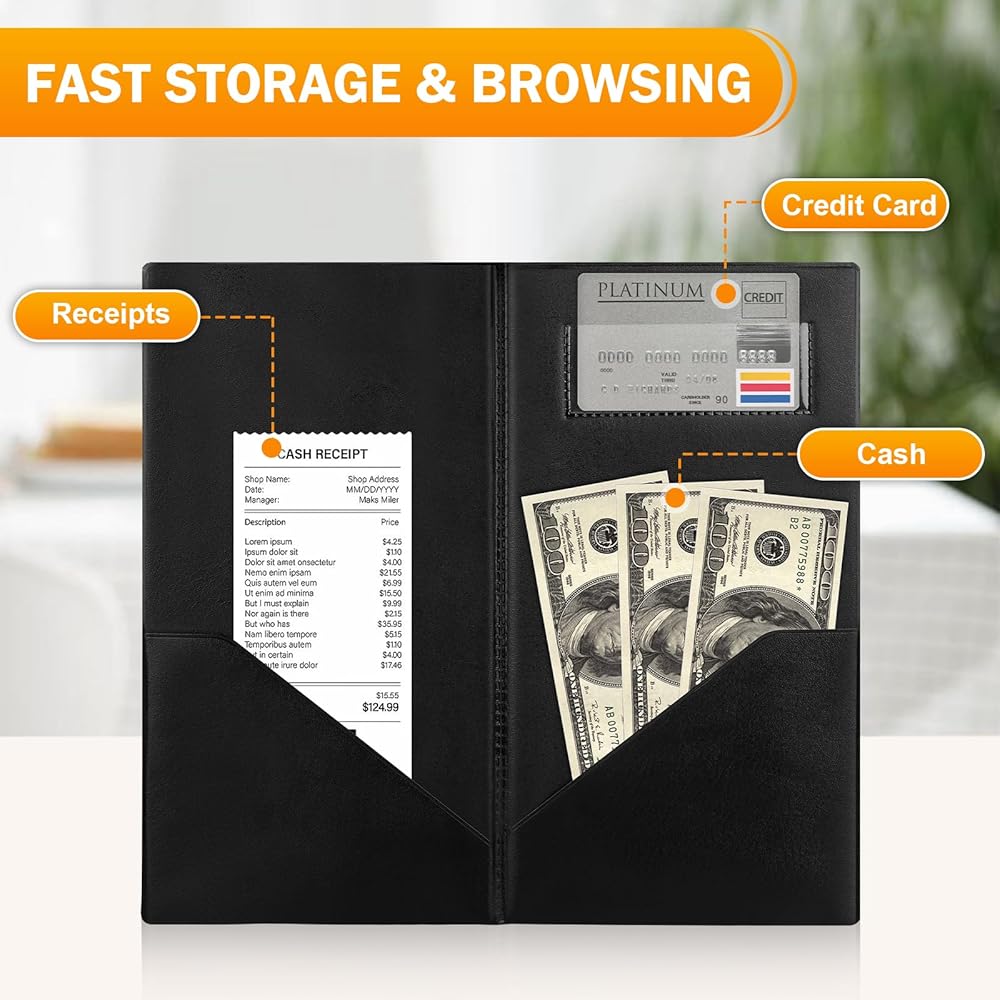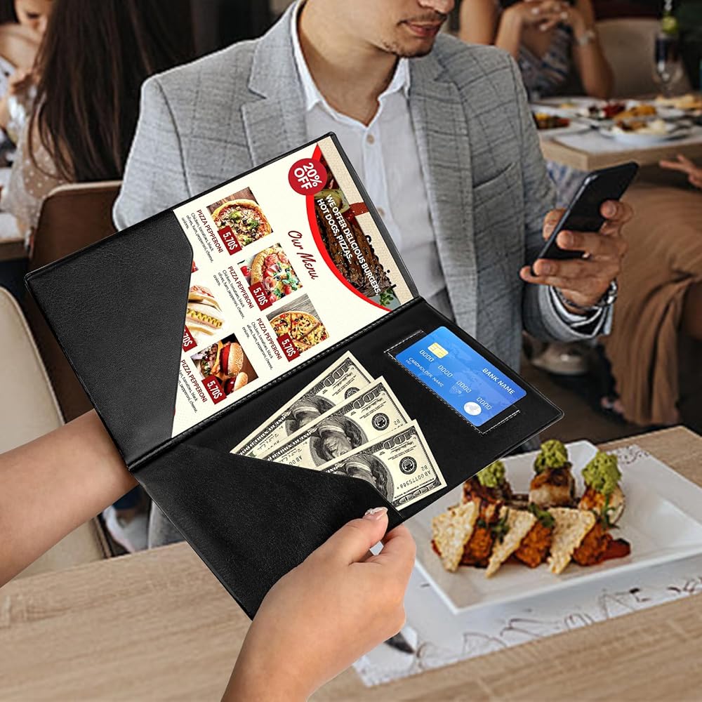 DESIGNED FOR SERVICE: Two built-in side pockets and one clear card pocket, convenient for you to easily organize your guest checkbook, special menus, credit cards, receipts and money. The restaurant check book allows restaurants and servers to serve guests decently.