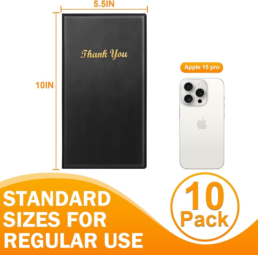 MULTIPLE QUANTITIES AT A GREAT COST: This 20-pack of check books for restaurant will meet your bulk needs. Measures 5.5 x 10 inches and is 0.2 inches thick. Great for keeping in your apron or holding in your hand. Extra points for your service.
