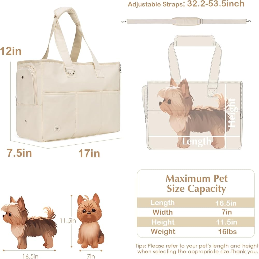 [Practical Size] Product dimensions: 17"L x 7.5"W x 12"H and - this soft sided pet carrier perfect for small dogs (like Chihuahua, Havanese, Pomeranian, Miniature dachshund, Maltese and more) and cats. Suitable for pets weighing 16 pounds(7 kg) or less, such as dogs, cats, and rabbits. Note: please measure your pet's length and height before purchase. Hand washable bottom board, interior material made of polyethylene.