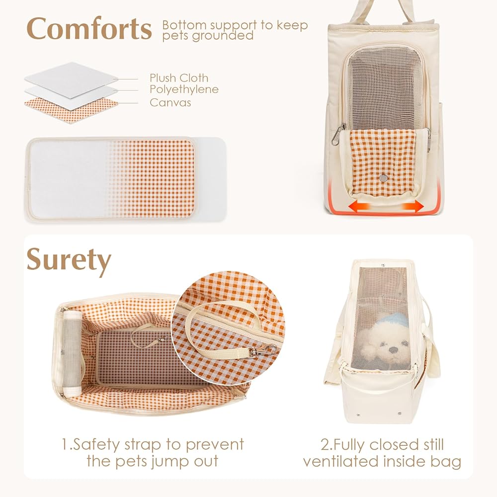 [Designed With Safety In Mind] Equipped with built-in adjustable safety leash and self-locking zipper to secure your pet and prevent it from jumping out. Removable and machine washable cushion for extra coziness. This portable pet tote bag carrier is ideal for daily use, hiking and travel use.