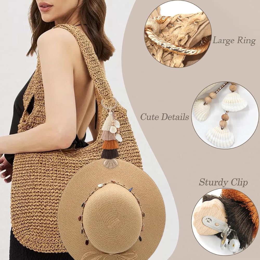 Smart Design- Not only beautiful, this bag tassel is designed with new function as a hat holder for travel. By adding a cute shell shaped clip, it would firmly hold your hat, enjoy freedom!