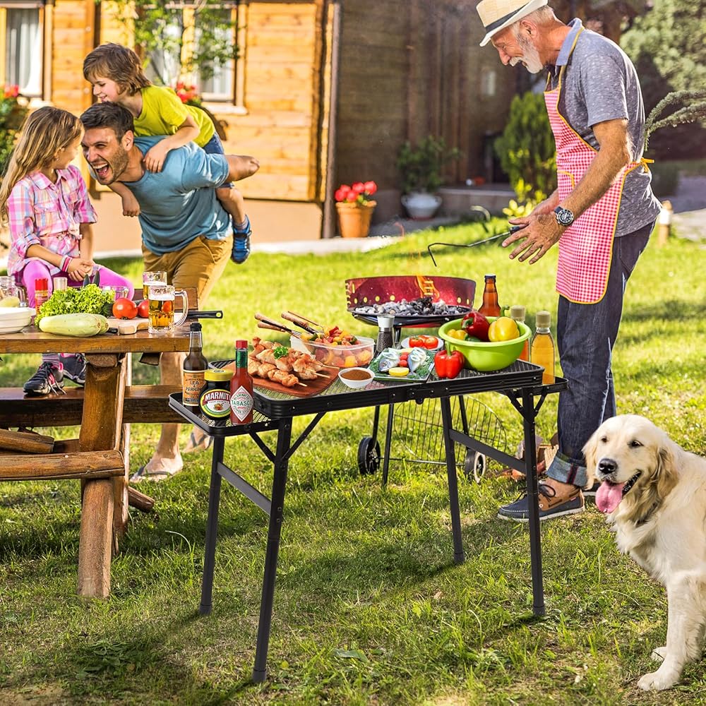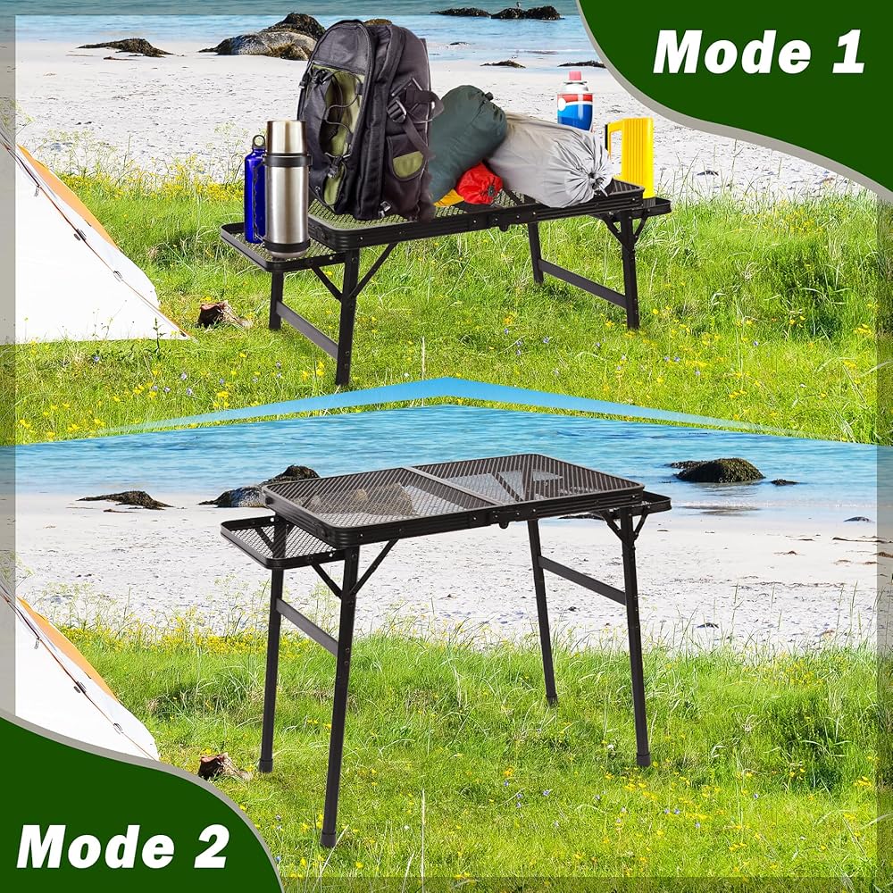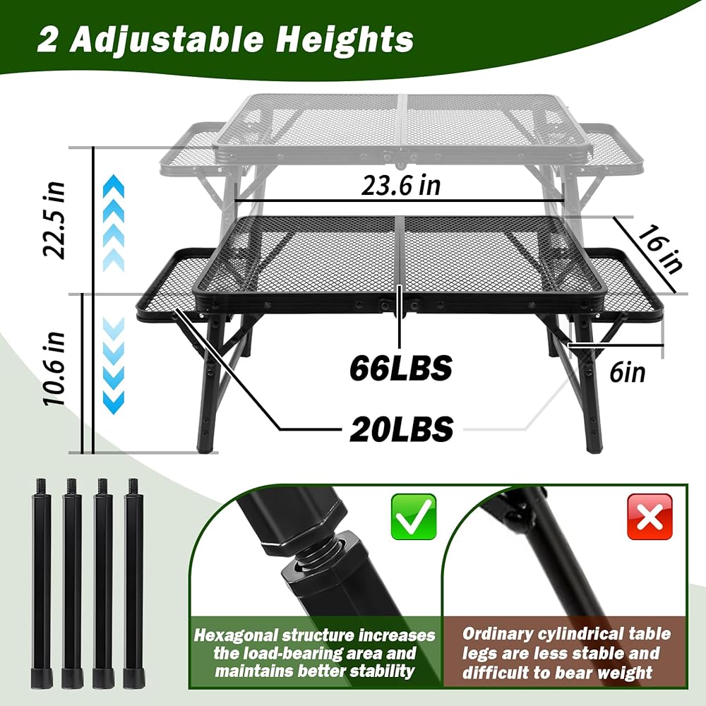 ❗【Sturdy & Durable】Desktop using 1.8 mm high-grade steel mesh, the surface is also coated with a special powder, can be heat-resistant and waterproof, the edge of the steel mesh after polishing, smooth will not be sharp for hands, with a certain of security, thickened aluminum frame light weight, but also to avoid rust due to accumulation of water, and the hexagonal thickened and reinforced steel tube legs, as well as the triangular shape and safety latches design is greatly increased the table's load-bearing area and force range, can prevent the foldable table from causing deformation, but also more to improve the support and stability of the entire grill table, with a longer service life!