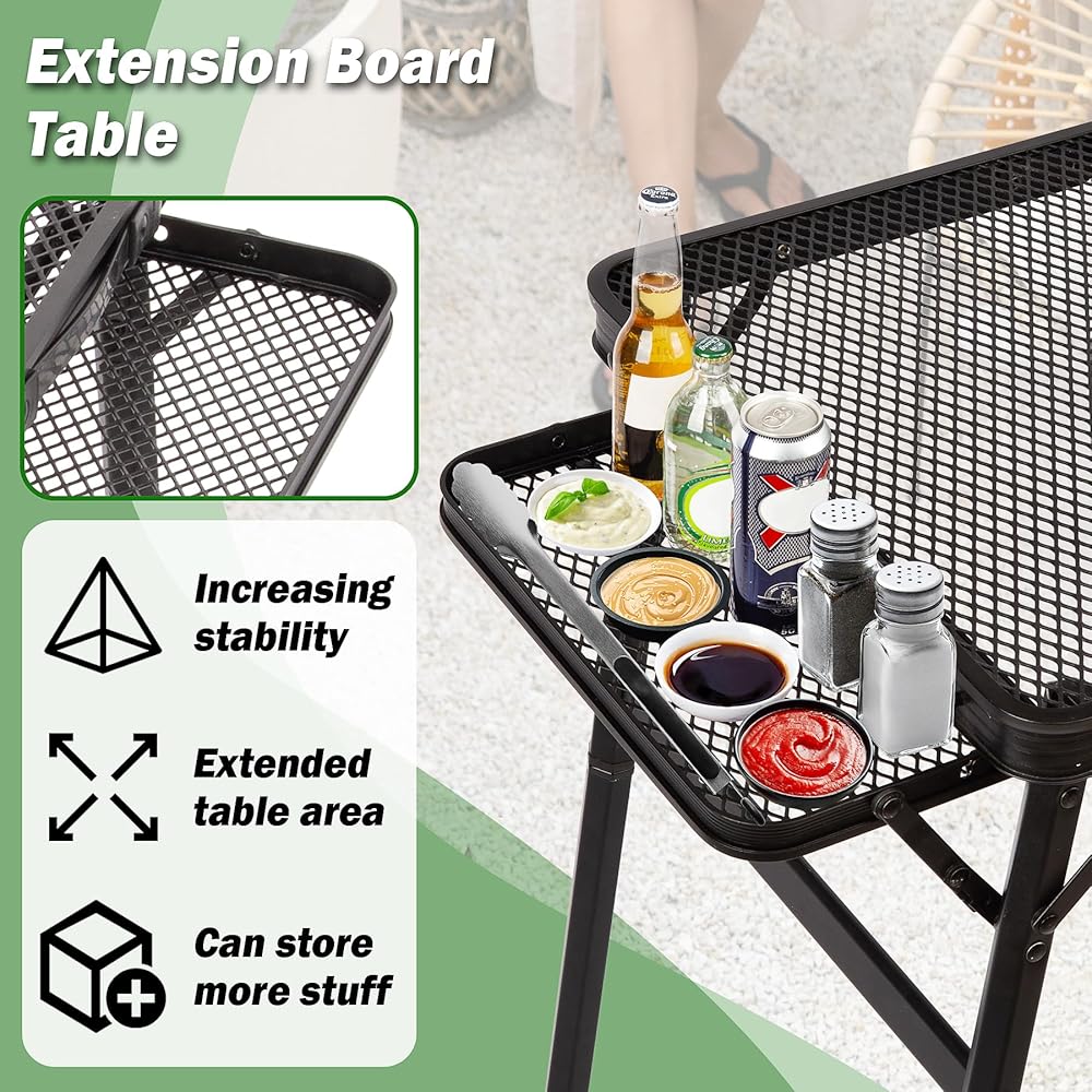 🖇️【Folding Table with Wings Panels】Through research, modification and design of a new grill table, on the basis of the original ordinary folding grill table, in order to accommodate more items, we have added 2 extension panels on the sides of the table, increasing the grill table's use of an area, you can put more food, beverages, barbecue grills, tableware, spices, etc., to provide more space for the necessities, do not want to use the 2 extension boards, you can also be individually flipped and folded up!