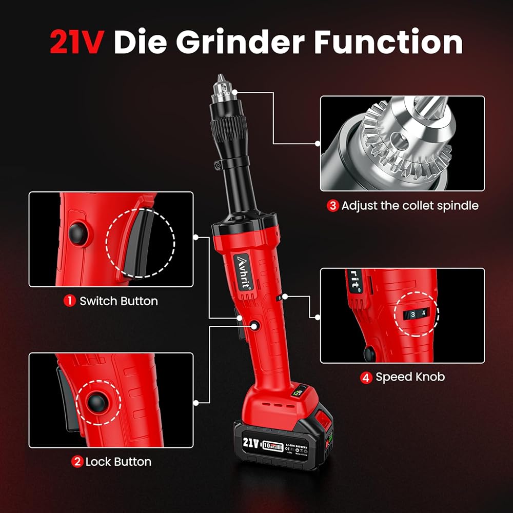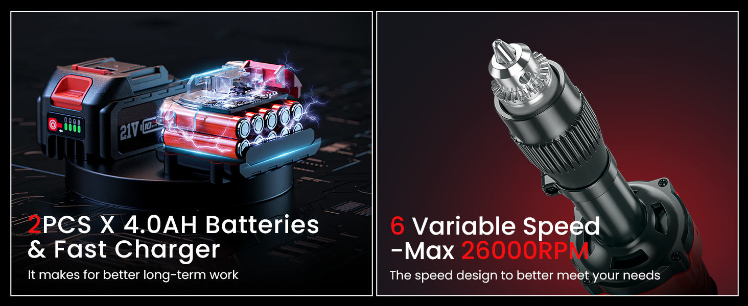 【2PCSx21V 4.0AH Batteries】 Cordless Die Grinder is equipped with two 2.0Ah large-capacity lithium battery and a fast charger that has been tested for multiple charging cycles, with charge and discharge protection, which means grinders power tools full day of operation is perfectly feasible. Don't worry about running out of power at work.
