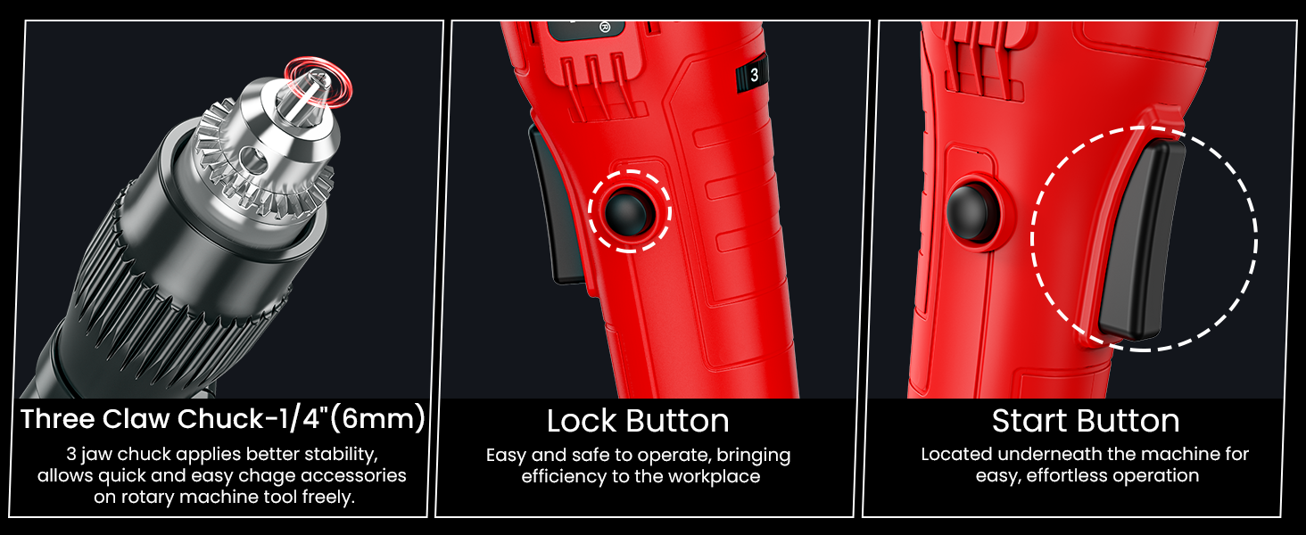 【Ergonomic & Lightweight Body】The die grinder features a slim design and has a lightweight but durable and solid body, comfortable to maneuver and features a locking button to reduce hand fatigue during prolonged use.. The ergonomically designed body is comfortable to hold for long work sessions.