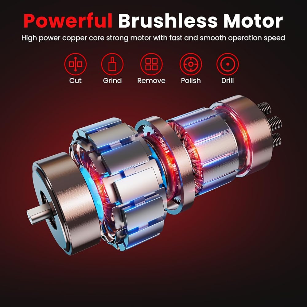 【Powerful Brushless Motor】The die grinder features Brushless motor Technology, the powerful motor provides high speed and torque for efficient grinding and cutting. It can handle a variety of materials, such as metal, wood, etc.