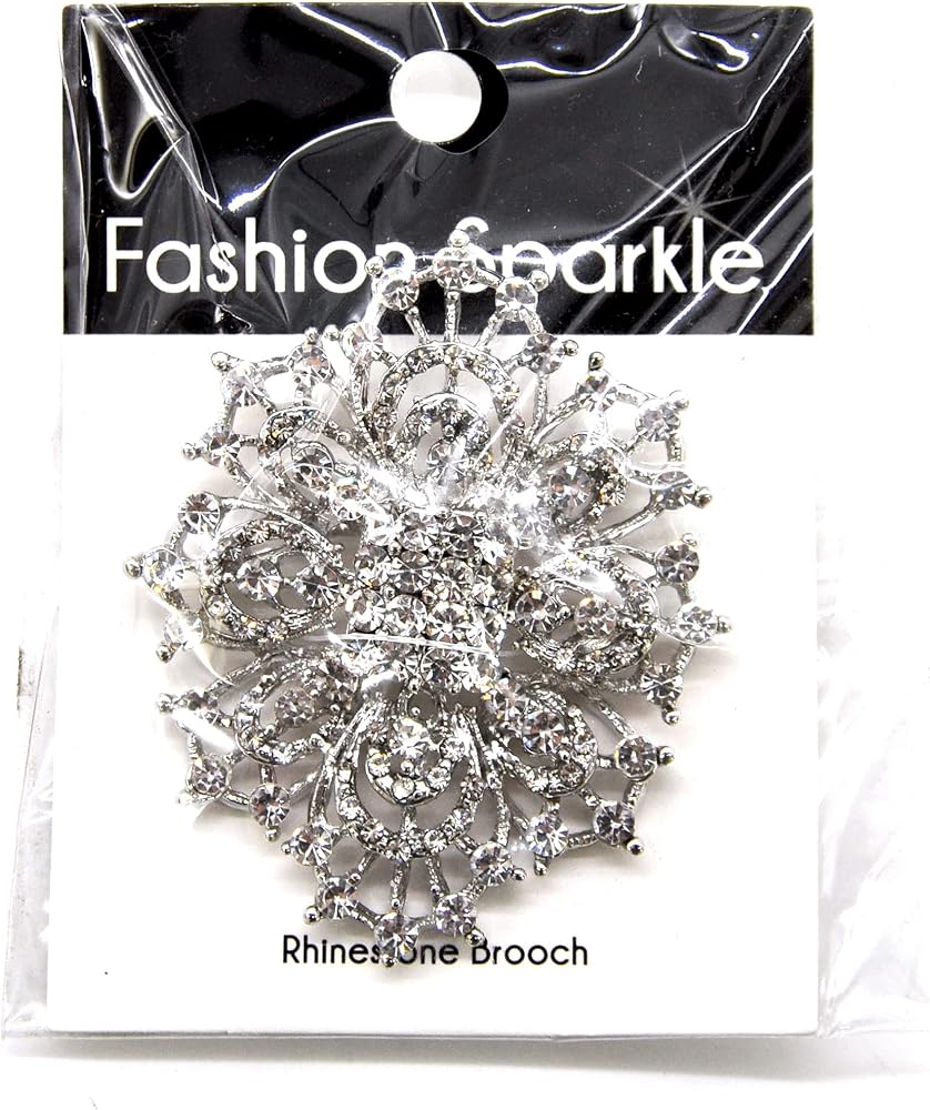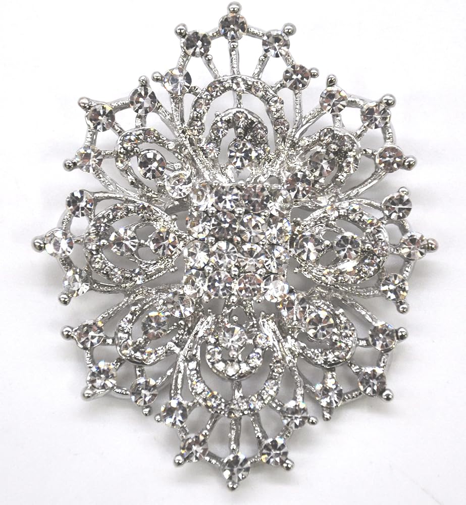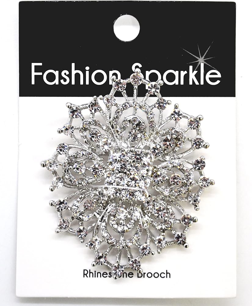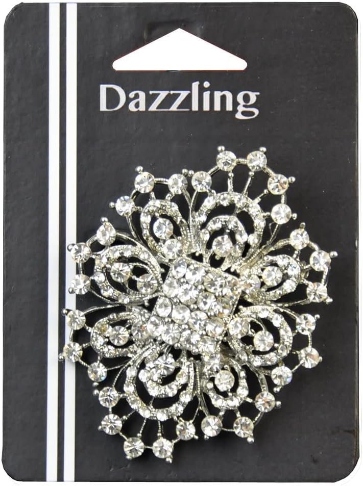 Dazzling 2-1/2-inch by 2-1/2-inch silver and crystal floral rhinestone brooch is sold as single carded unit. Brooches can be used to accent clothing, hats, scarves, pillows, handbags and jewelry. They have a clasp on the back that can be removed to attach permanently to any project.