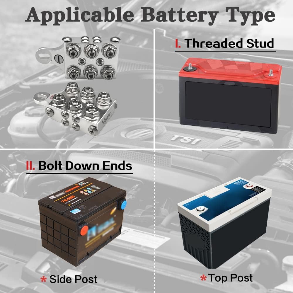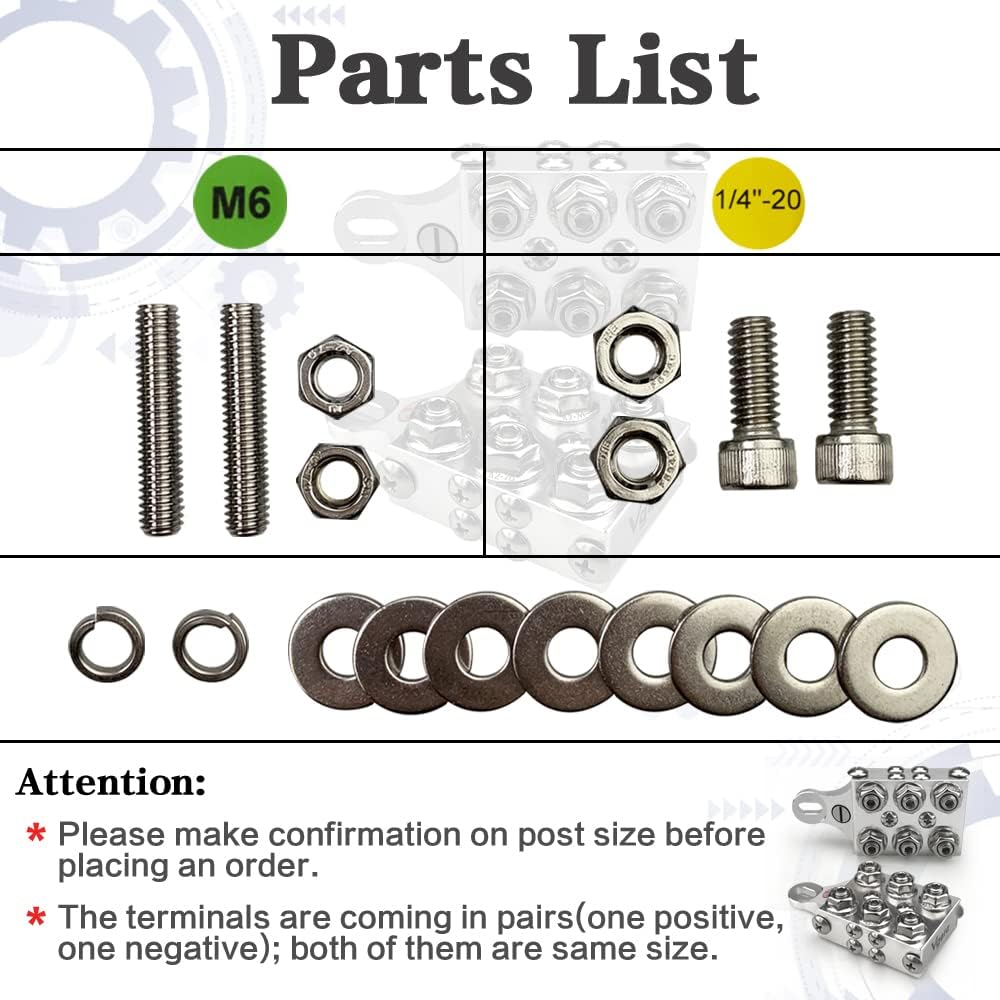 🎁 - 『For Post Size』: M6 or 1/4”-20 ; 『Battery Post Type』: Bolt Down Ends or Threaded Stud.