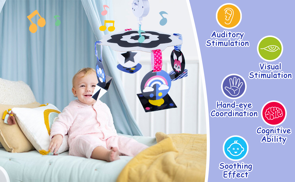 Music Box Function: The music box built into the nursery mobile has a spring design. Gently rotate the spring to play soft music. The crib mobile helps soothe the baby's emotions and create a peaceful and comfortable sleeping environment for the baby.