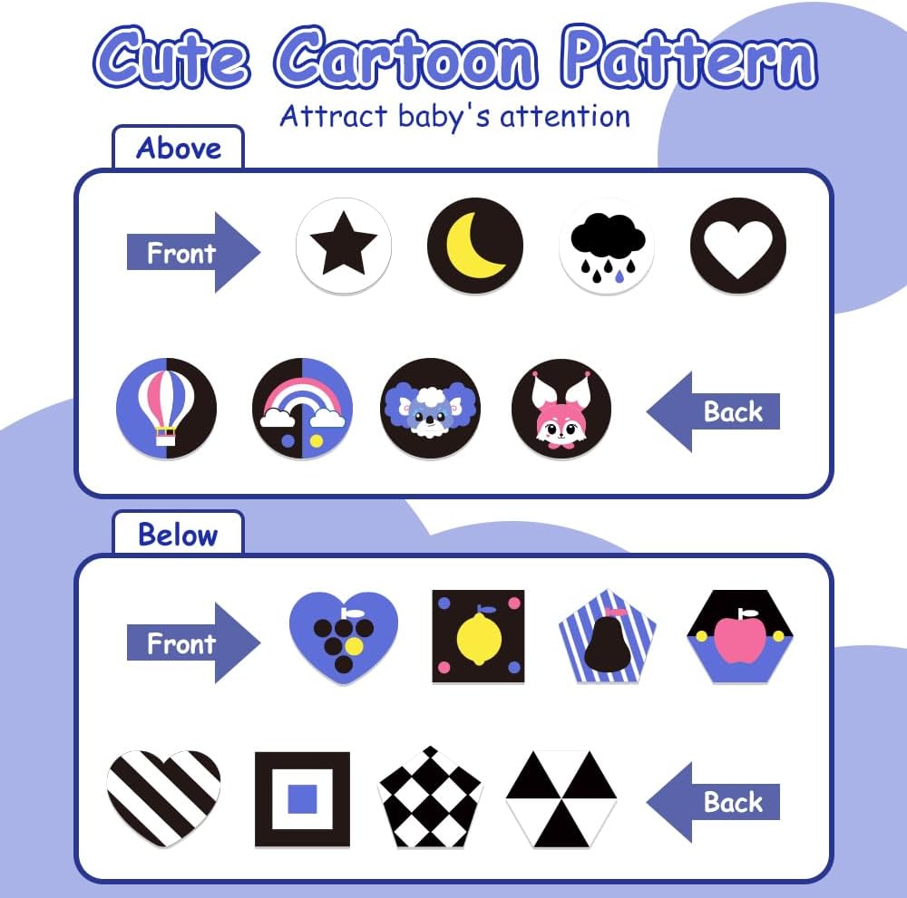 Cartoon Pattern Design: The paper pendant on the crib mobile is designed with vivid and cute cartoon patterns. The front and back of the paper pendant are designed with black and white and color patterns respectively. Baby mobile for crib meets the visual development needs of infants and young children, can attract the baby's attention, increase visual interest, and contribute to the development of the baby's visual cognition.