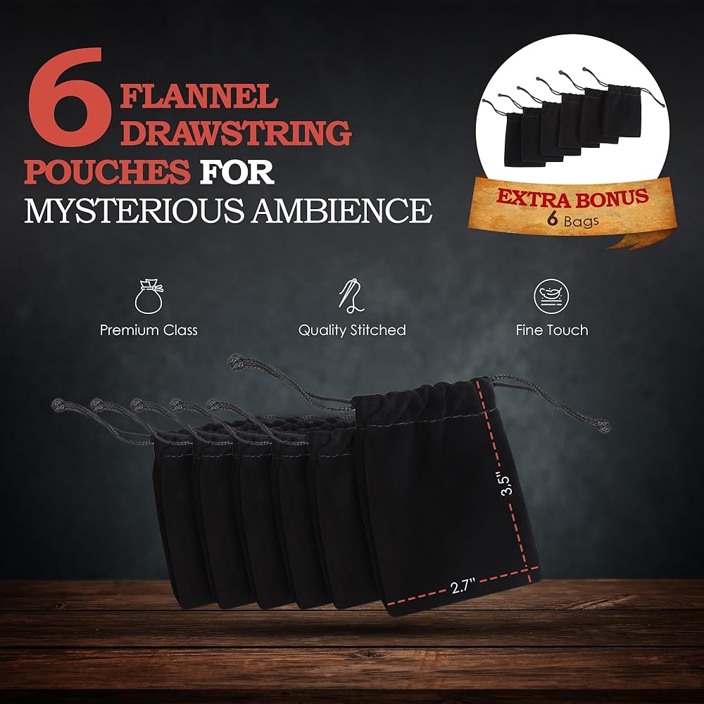 In The Box: The D&D set holds the rulebook and the advanture book for the Host. There are extra 6 sets of playing dice of varied colors, which is very convenient as each player can choose their favorite color. Each dice set counts 7 dice. You will also get additional 6 dice storage bags. Black flannel drawstring pouch to bring in more mystery. You can also download and print out some game extras online with a lot more interesting option