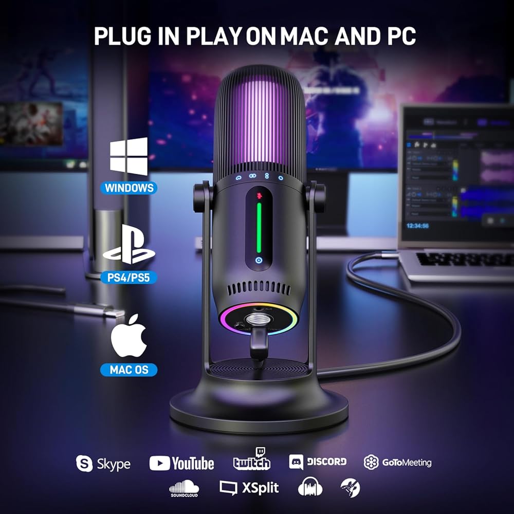 CONTROLLED RGB LIGHTING: The gaming microphone have dynamic multi-color gradients and 8 static solid-color effects, which creates a personalized gaming atmosphere and makes your streaming more appealing. You can press the button at the bottom of the microphone to switch the different color and turn on/off the RGB