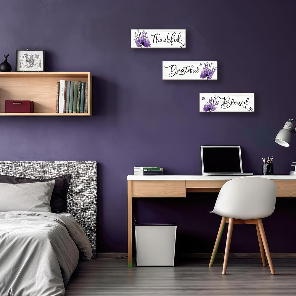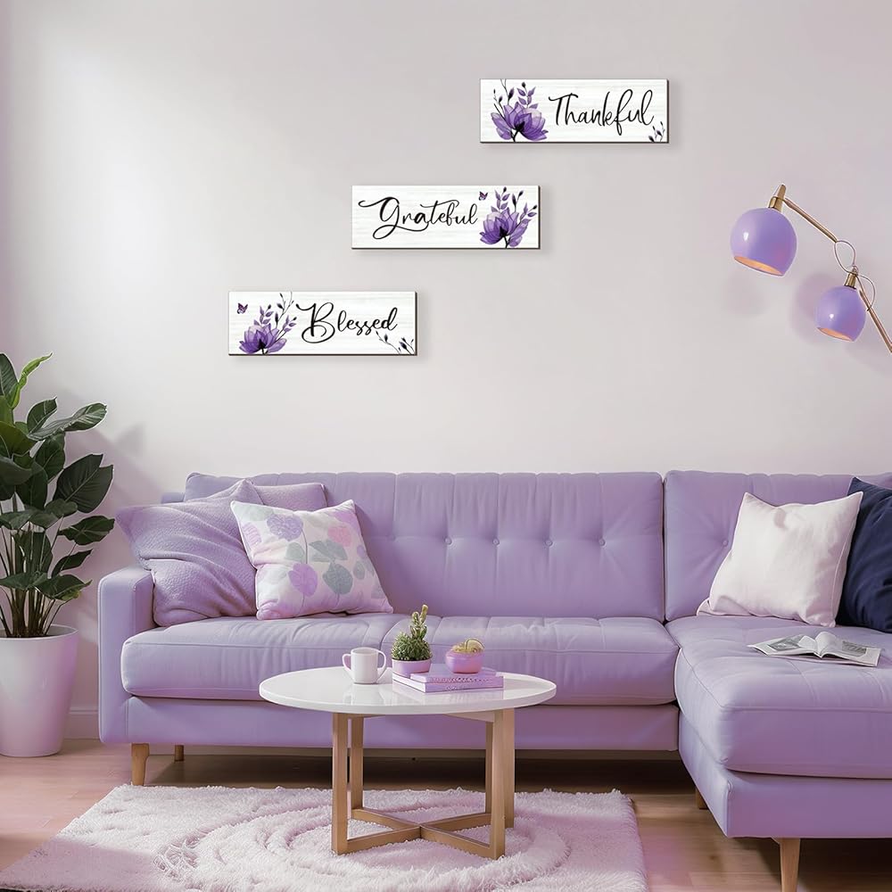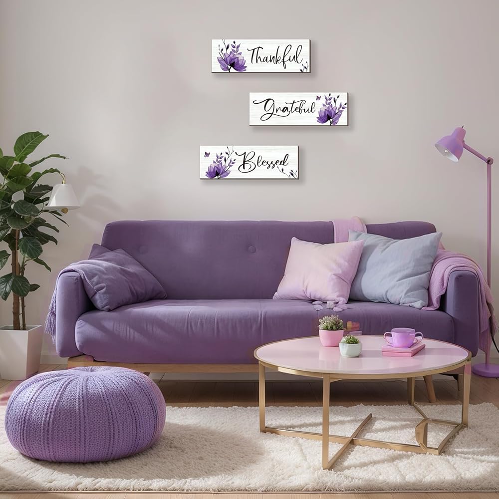 Inspirational Words for Positive Ambiance: Purple wall decor infuse positivity into your surroundings with carefully chosen words – [Thankful], [Grateful], and [Blessed]. These inspirational messages bring a sense of gratitude and joy, setting a pleasant mood in any space.