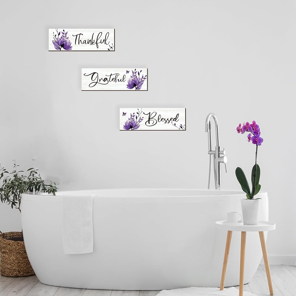 Set of Three for Harmony: Elevate your decor with a curated set of three purple bathroom decor pieces, each featuring unique words – [Thankful], [Grateful], and [Blessed]. Achieve a harmonious ambiance throughout your home.