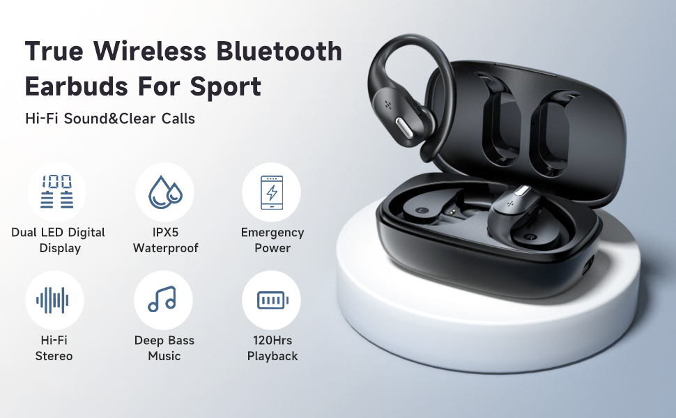 【Ergonomic Design for sport& IPX 5 WaterProof】:The A12 wireless headphones feature an ergonomic design with comfortable and soft ear hooks, ensuring a secure fit during sports activities without falling off. Additionally, multiple sizes of ear tips (S/M/L) are provided for you to choose from, offering a better wearing experience according to your preferences. Constructed with IPX5 waterproof material, these bluetooth earbuds allow you to exercise without worrying about sweat entering the earbuds.