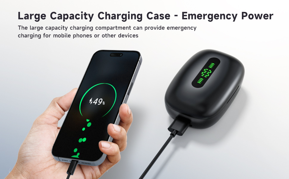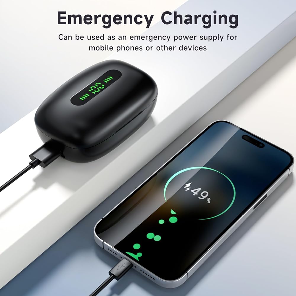 【120H Standby Time &Emergency Power】:Wireless Bluetooth earbuds with a charging case have a playback time of up to 120 hours, and a single full charge of the wireless headphones allows for 9 hours of playback. The ultra large capacity 1200mAh charging case of the Bluetooth wireless headphones can serve as an emergency power source for your phone, helping you provide emergency power to your phone.In addition,The charging case supports USB C charging.