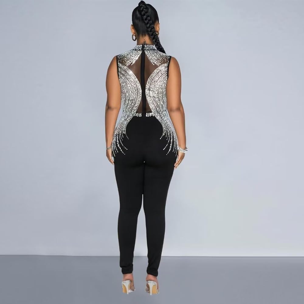 Sexy sequin rhinestone bodycon jumpsuit for women, sparkly sheer mesh see through romper, hot drilling process patchwork jumpsuit, sexy sleeveless clubwear, women's mock neck jumpsuits, invisible zipper stretchy jumpsuit, party night, wedding, evening, ceremony, birthday, wedding cocktail guest gown dating out clubwear