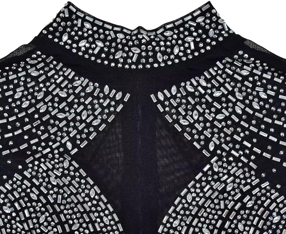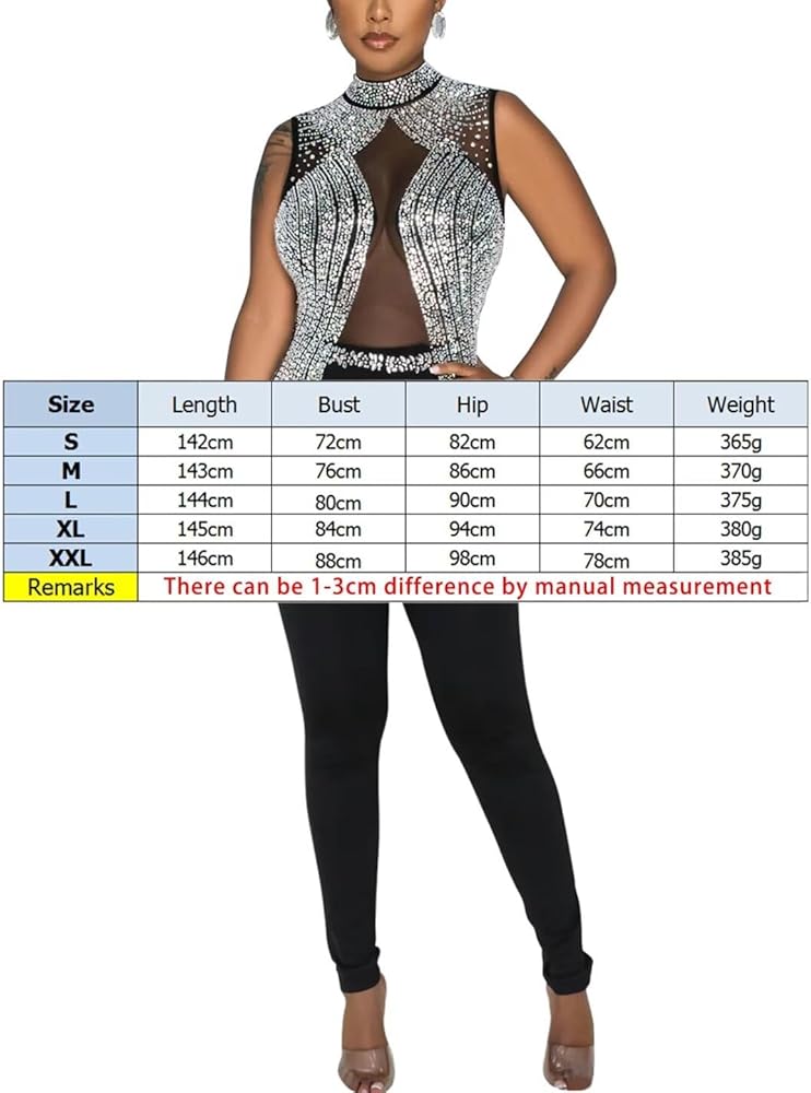 Features: Sexy hot drilling process jumpsuit for women, sleeveless, high neck, patchwork, rhinestone jumpsuit, bodycon sheer mesh jumpsuit for women, slim fit, hot sexy see through romper, stretchy rhinestone romper,invisible zipper on the back,elegant and easy to wear and take off.