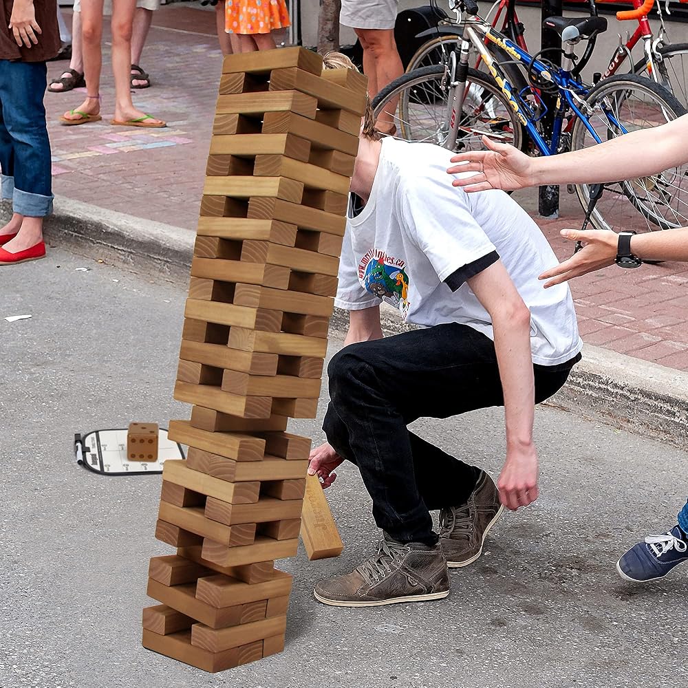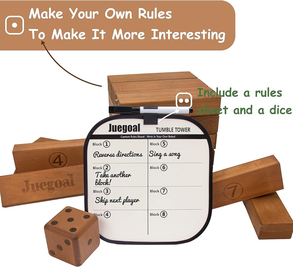 Giant Size Timber Game Set: Juegoal large size brown color giant tumble tower set comes with 54 pieces wooden tumble blocks, 1 pcs game board with pen and a zipper bag. Each block is 6.9 x 2.3 x 1.2 inch, 2FT (18 rows) could be grown up to 4FT tall tower when played. A great fun, fast-paced stacking game and indoor or outdoor playing game for all ages