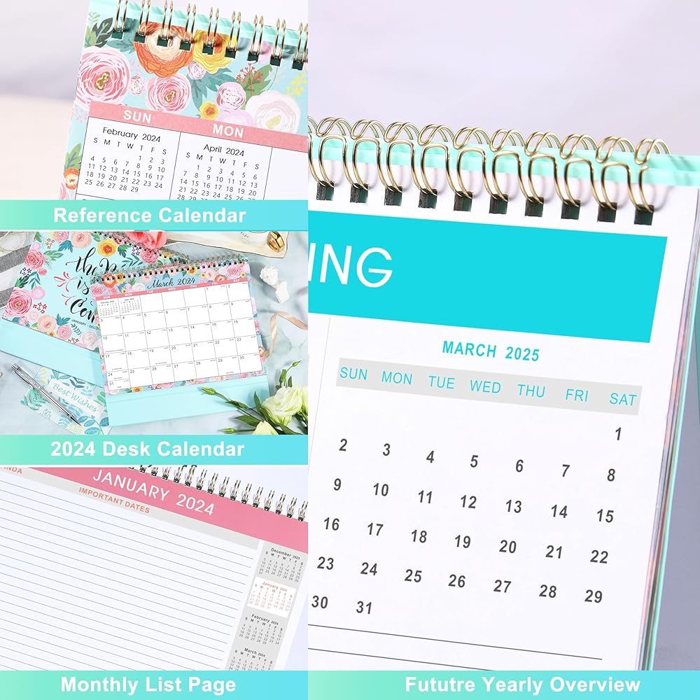 💐 QUALITY & EFFECTIVENESS - Thicker pages than normal 2024 calendar in the market to reduce ink leakage, erase fraying and shade issues + Mint thick board to stand steadily + Printed with high quality and well-balanced color ink. With this 2024 desk calendar, your life will be more productive and effective.