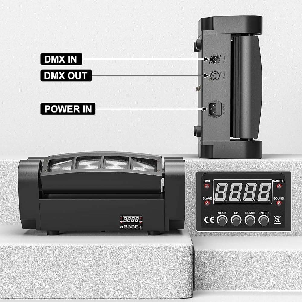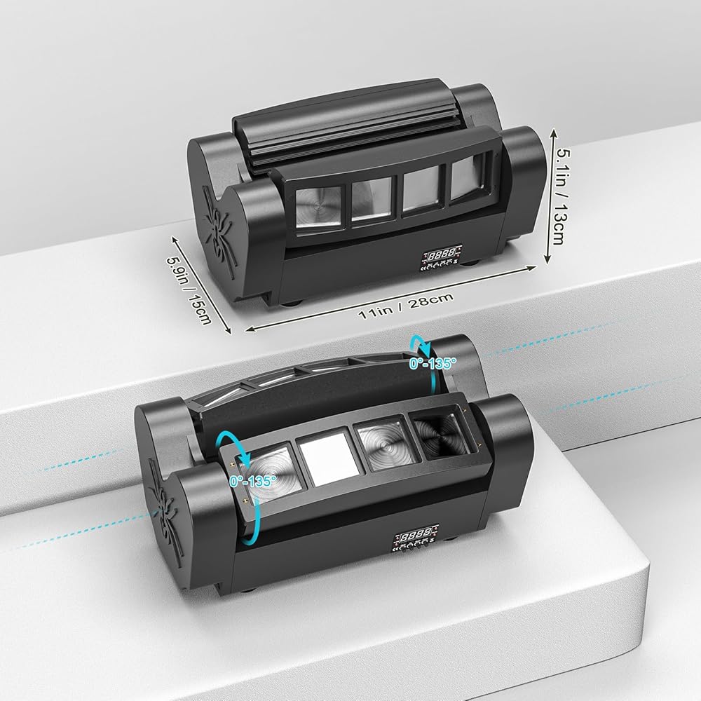 ❤RGBW Dj Light: Spider moving head light with high-speed electronic flash/random strobe (1-25 times/s),consists of two independent motor-driven rotation and work alone. Pulse&strobe effects up to 1-25 flashes per second (Dimmable Range: 0-100%).