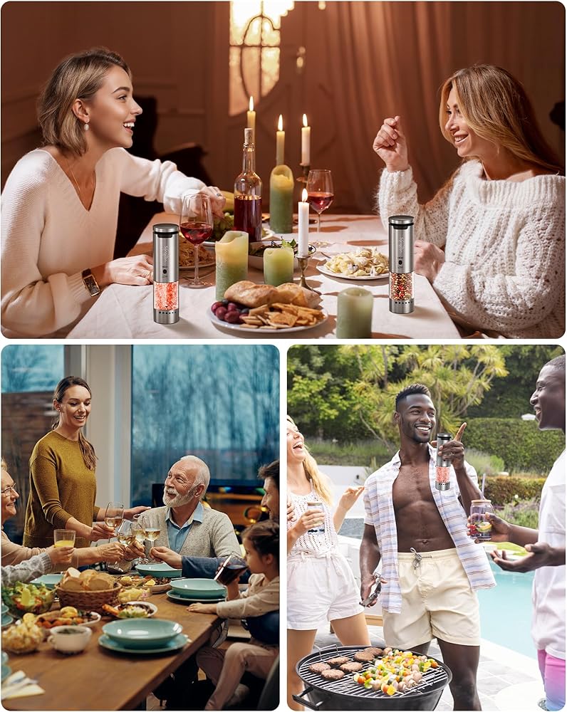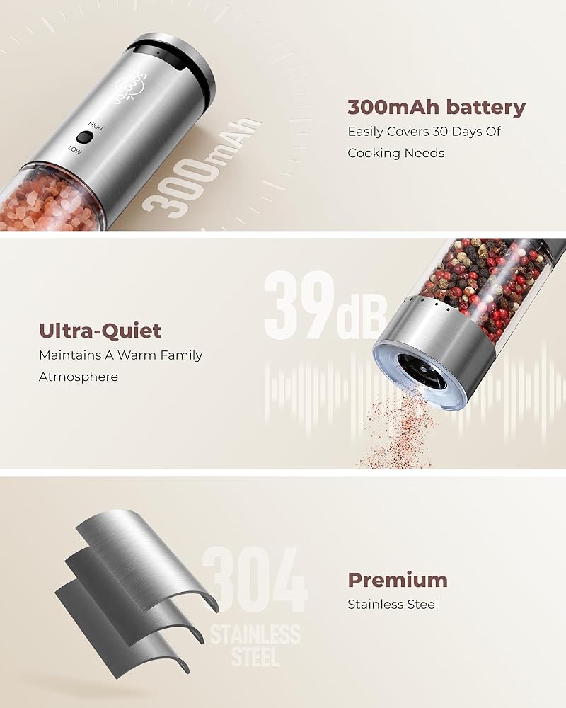 ✅ Stylish & Elegant Design. The pepper mill electric with modern design and stylish look is the perfect addition to any kitchen or dining table, and a great gift for anyone as it comes packaged in a premium box. The exquisite box comes with 2 grinders, 1 spoon & brush, and 1 charging storage base. Perfect gift for Christmas, Father's Day Gifts, Mother's Day Gifts, Thanksgiving, Valentine's Day, anniversaries, and new house housewarming gifts.