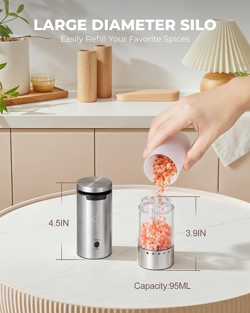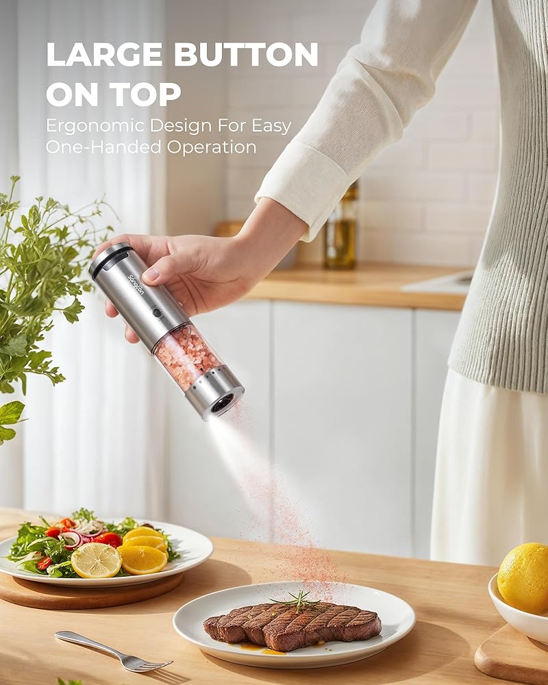 ✅ Automatic Operation - The automatic salt and pepper grinder set allows you to say goodbye to the tedious work of a manual grinder and operate it with one hand operation for greater convenience and ease. The ergonomic design makes it easy for you to hold it for long periods of time. With the push of a button, you can enjoy freshly ground salt or pepper.