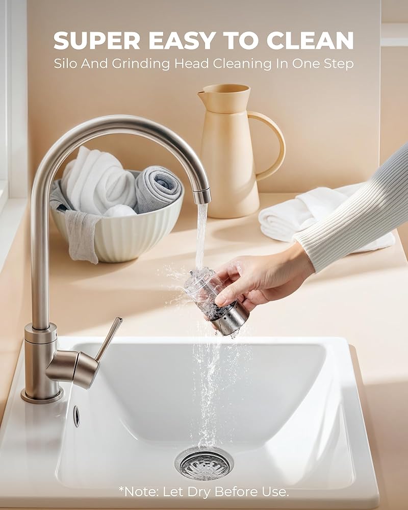 ✅ Adjustable Coarseness - Adjust the coarseness of the salt and pepper to preference. Twist clockwise for thinner and counterclockwise for thicker. Perfect for any dish. Note: When the electric salt & pepper grinder does not work, the ceramic grinding core may be stuck with particles. Please adjust the coarseness to the coarsest and start the grinder to release the stuck spices and it will work fine