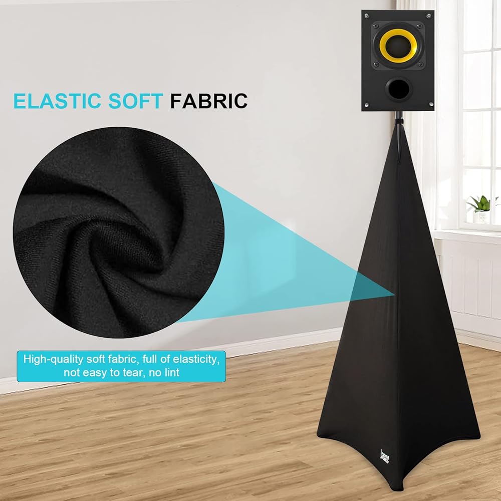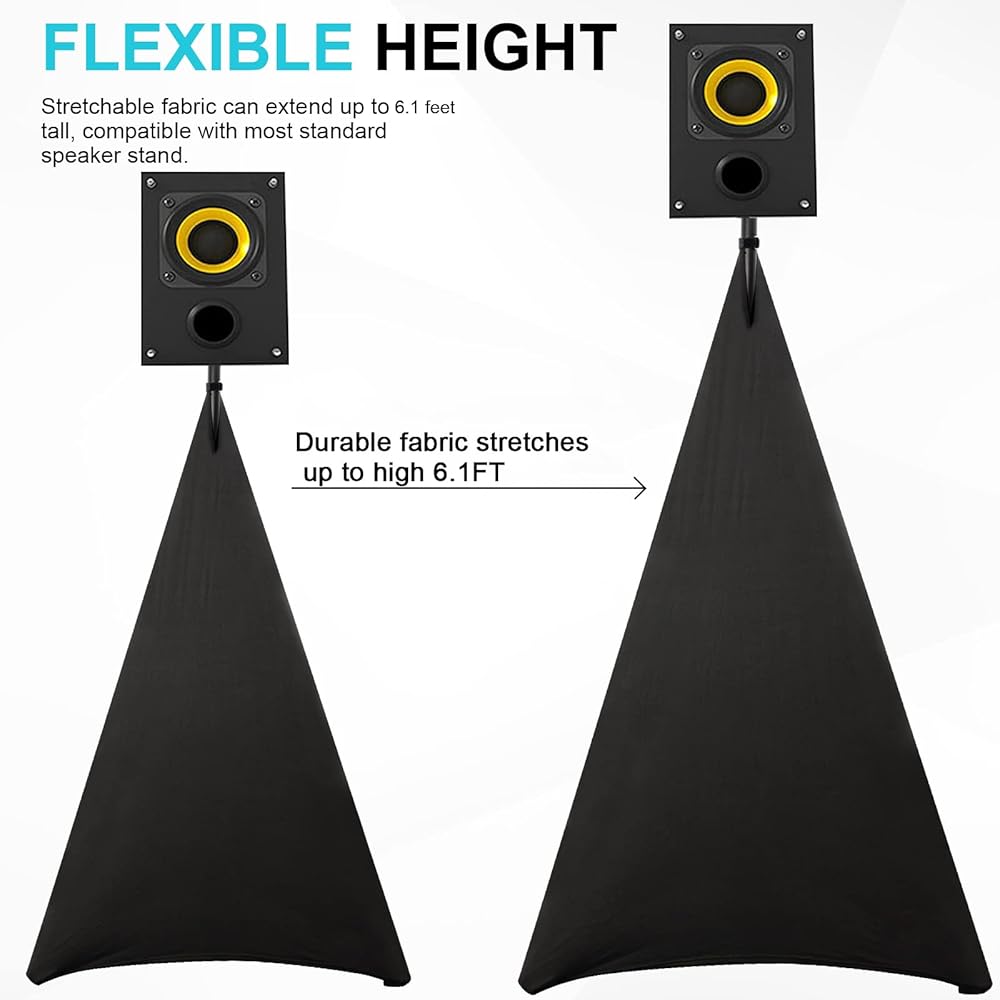 【High-quality Stretchable Lycra Fabric】Durable fabric stretches up to high 6.1FT, and the hook & loop strap makes for easy set-up and tear down.The elasticity of the fabric can be converted to the extension of the speaker tripod, Suitable for most standard speaker tripods.
