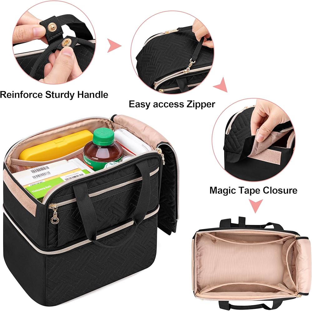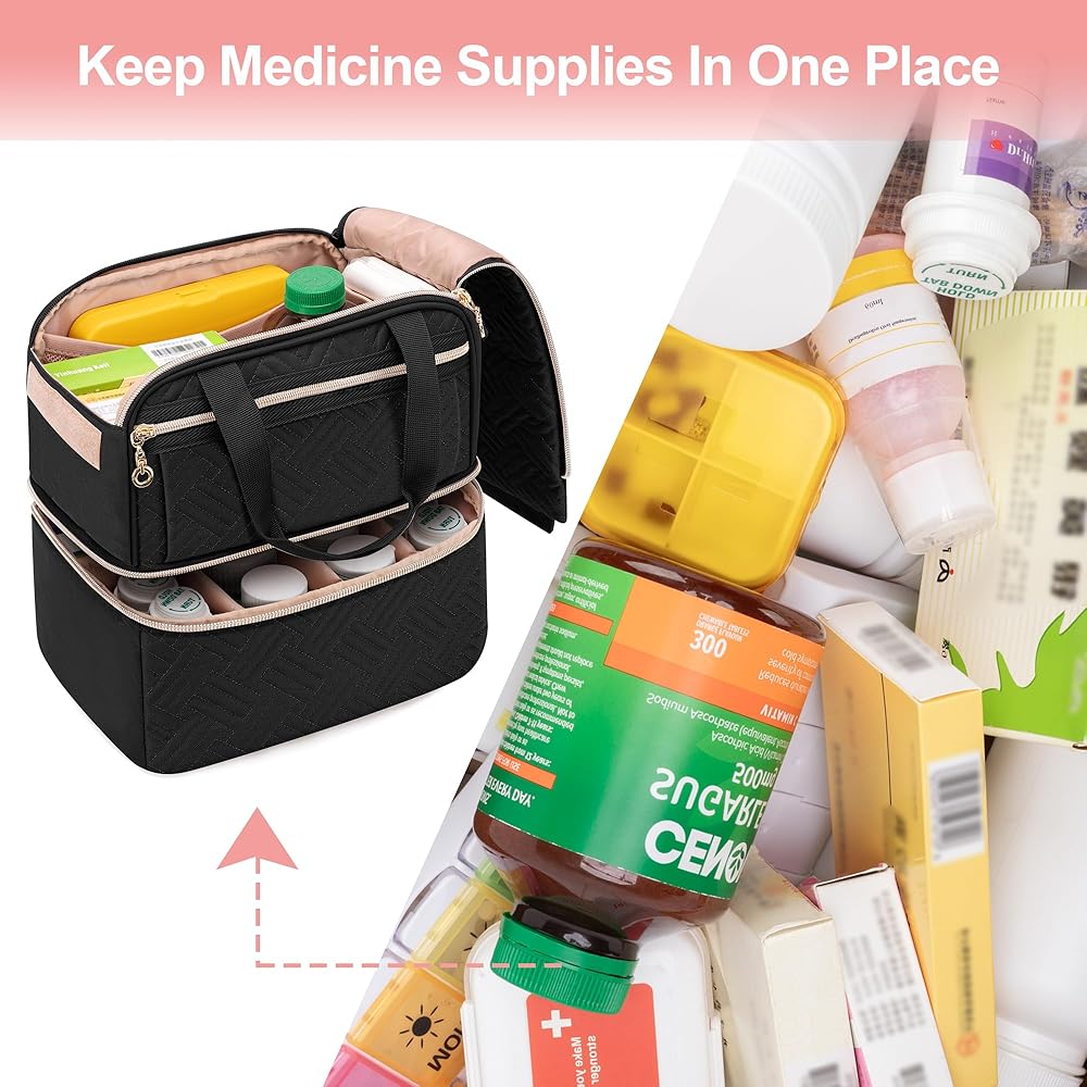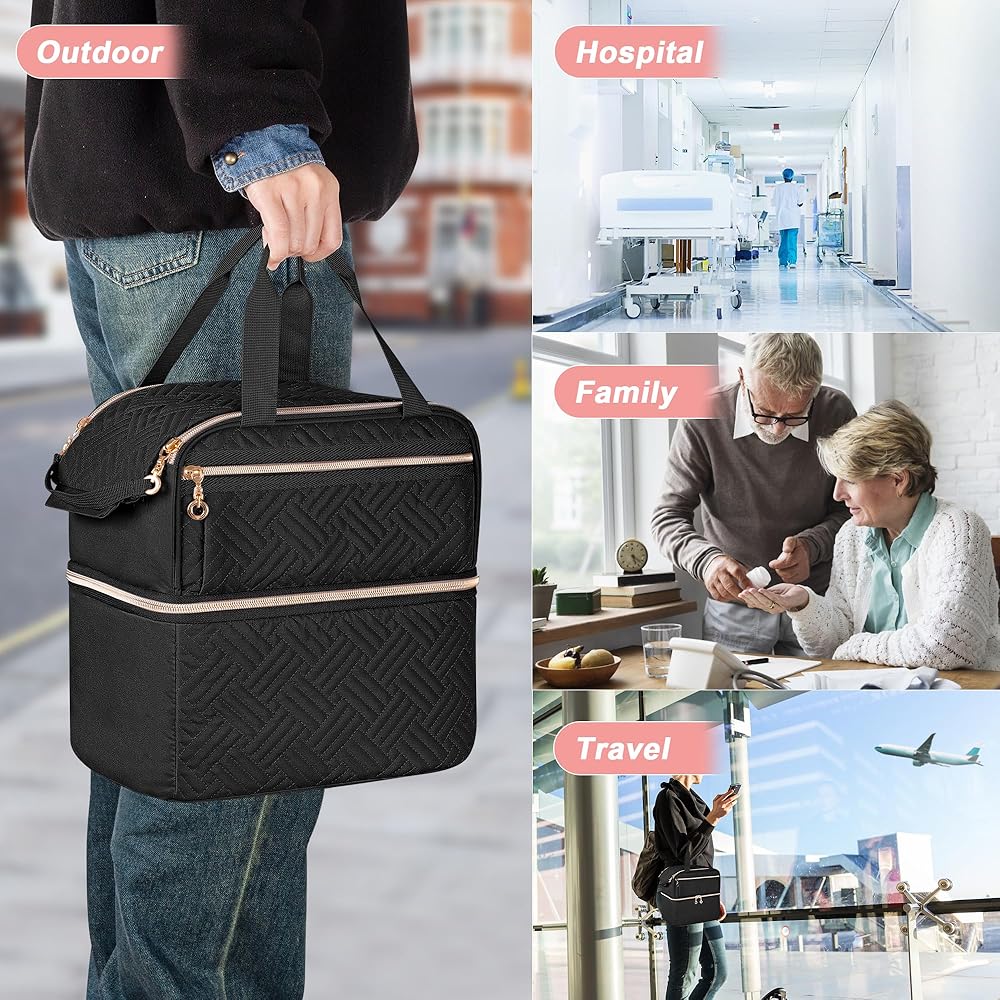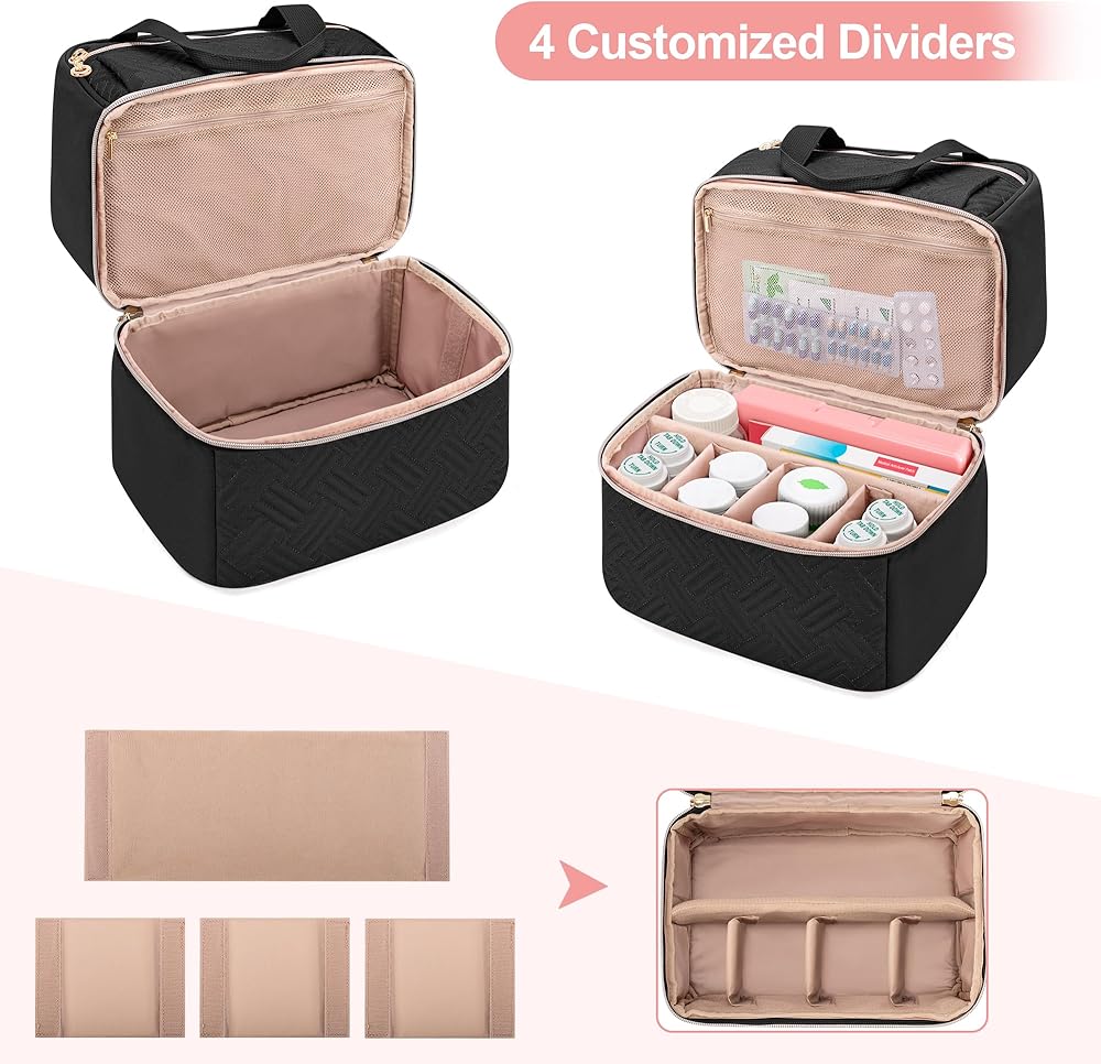 Damero Double Layers Pill Bottle Organizer Empty, Lockable Medicine Storage Bag Medication Travel Bag with 4 Customized Dividers for Prescription Bottles, Medical Supplements,Black