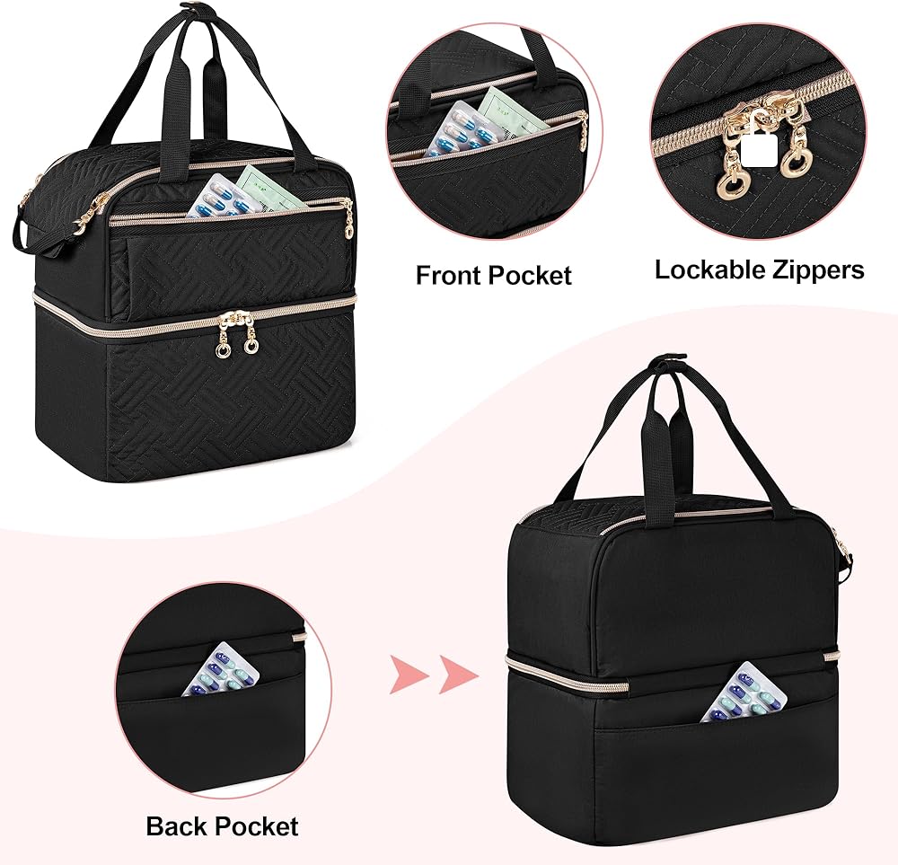 Secure Zipper Closure: The bottom compartment is equipped with lockable dual zippers to ensure the safety of your medicines.Front and back pockets keep your files or small items within easy reach.(NOT comes with the lock.Bag Only)