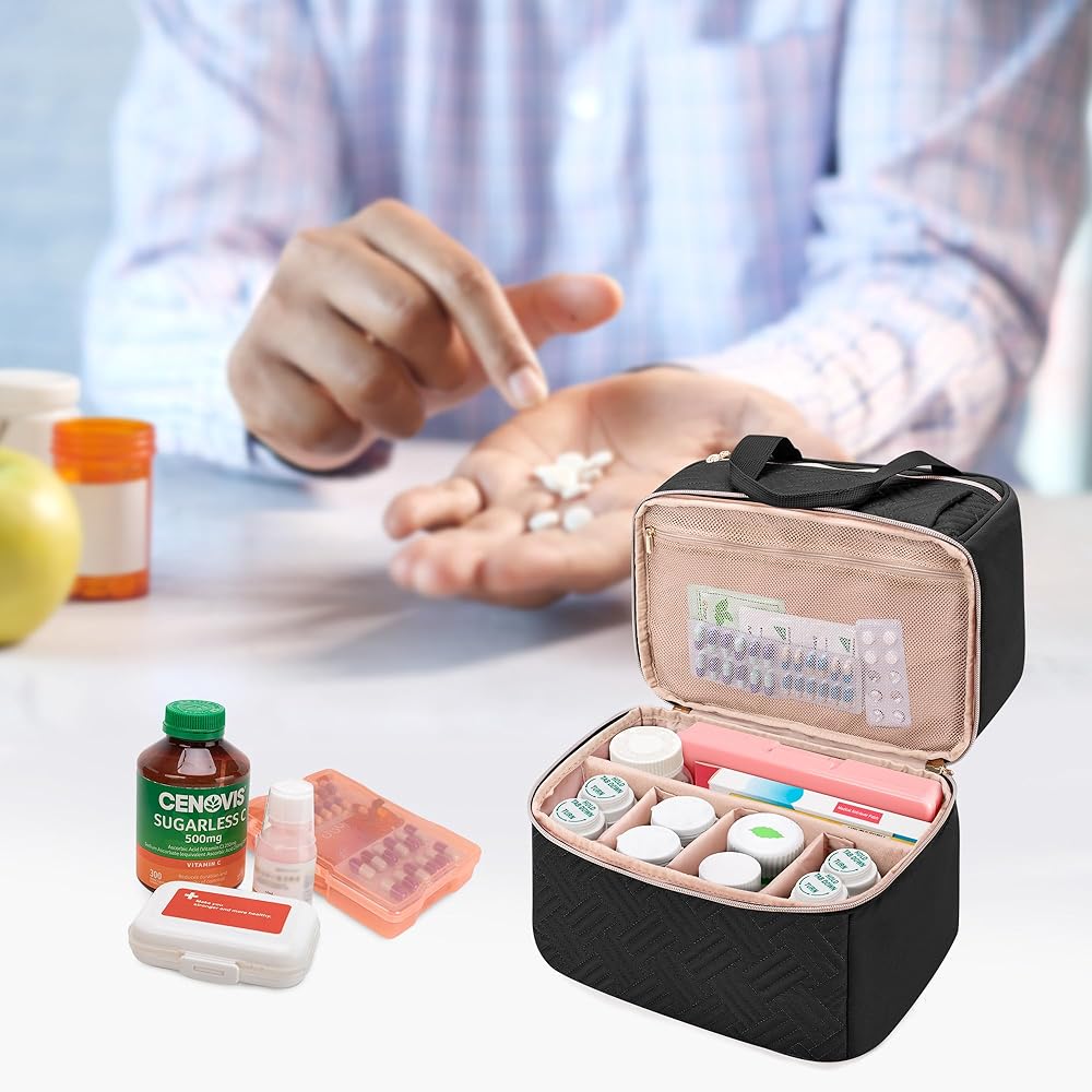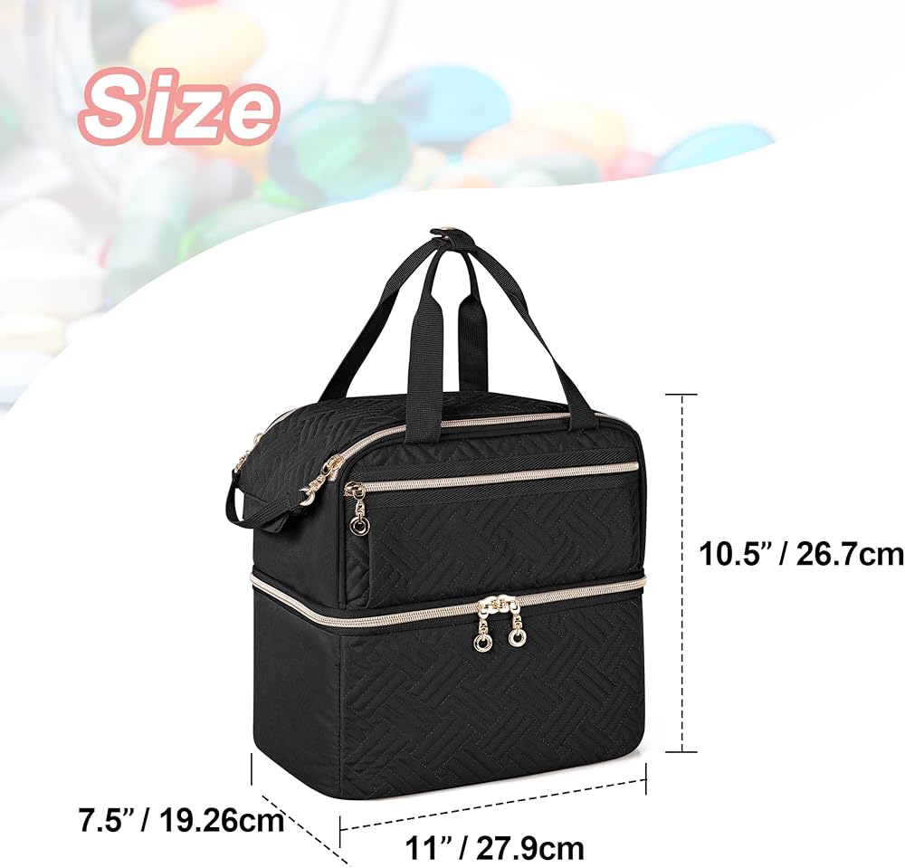 Convenient Portability: L11" x W7.5" x H10.5". The medication travel bag is made of quilted material. Well-padded design provides great protection. Portable carry handles for you to quickly pick up the medicine bag and go.