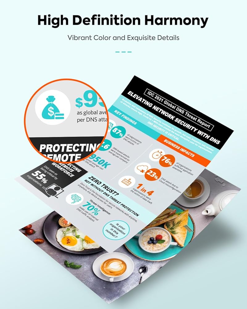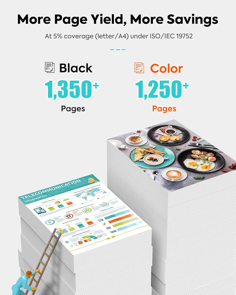 [Page Yield] Black cartridge can produce 1,350 pages. Cyan/yellow/magenta cartridge can produce 1,250 pages respectively. Page test is subjected to 5% coverage of the content per Letter/A4 paper.