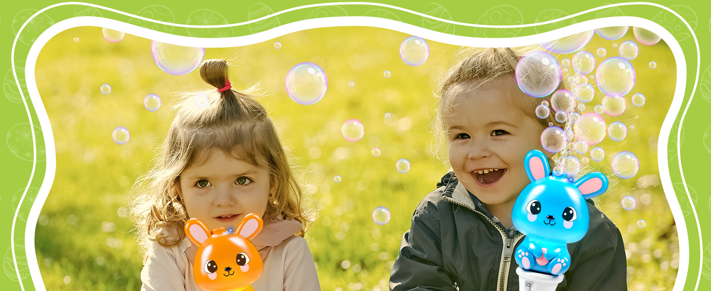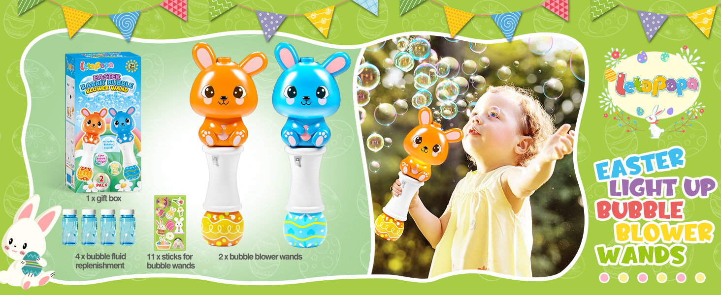 Unique Bubble Machine:Two bubble wands are cute bunny designs, in blue and orange, ideal Easter toys for boys and girls.Besides, the bubble wand kit also includes 4 bottles of bubble solution for supplement, and 2 stickers can be used as bubble wand decoration.Children will wander in a world of bubbles and enjoy hours of entertainment!