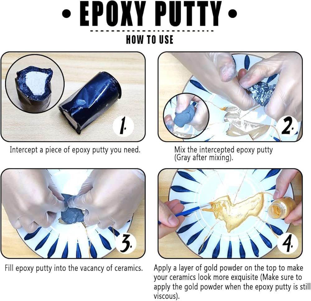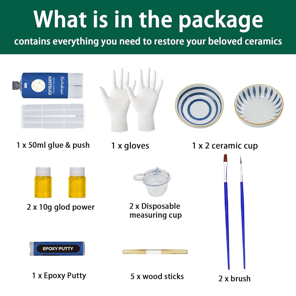 💓ENOUGH FOR YOUR NEEDS - he package includes detailed instruction, 1pcs 50ml glue, 1pcs 57g epoxy putty, 2pcs mixing cups, 2pcs white practice ceramic plate, 2pcs brush, 5pcs mixing sticks, 20g gold powder, 1pcs gloves.