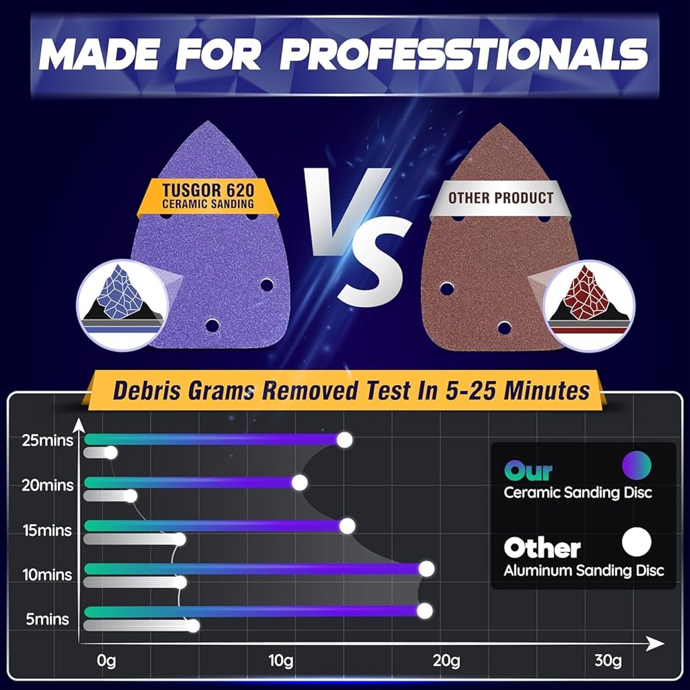 [3.5x Time Faster Ceramic Detail Sanding Disc]: Utilizing a high-grade purple ceramic, our sanding discs offer exceptional durability and cutting power, outperforming Aluminum Oxide discs in both longevity and performance. Perfect for a wide range of materials and applications, our detail sanding disc ensures smooth finishes on wood, metal, and more, making it a versatile tool for any project. The set has 5 type of grits: 60, 80, 120, 150, 220 (2pcs per type)
