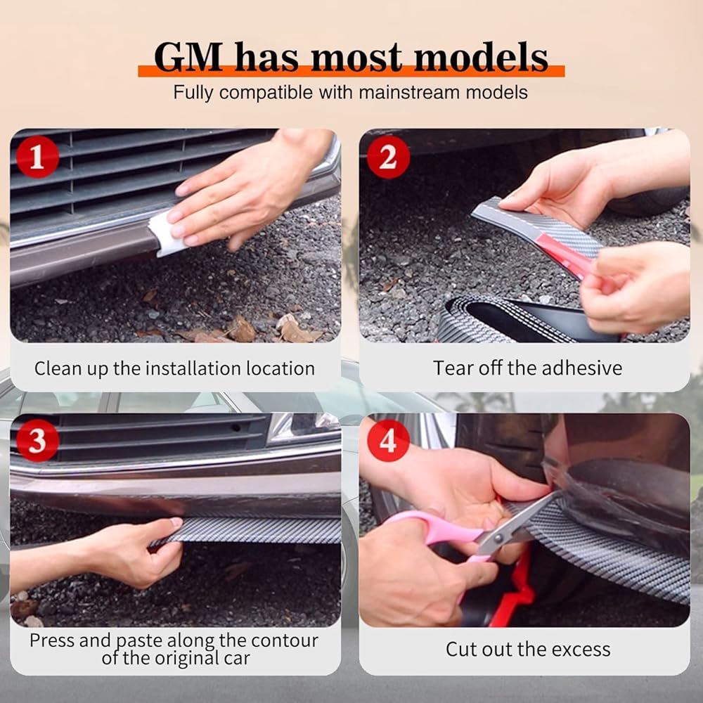 🚖 Function: The front carbon bumper lips help protect your car paint. Soft rubber withstands high speeds, extreme temperatures and car washes. This Front bumper guard protect car from scrapes, driveways, speed bumps and curbs. It also protect cars from collision and alleviate the damage. The front carbon bumper lips can be stick on front or rear bumper, body kit and side skirt.