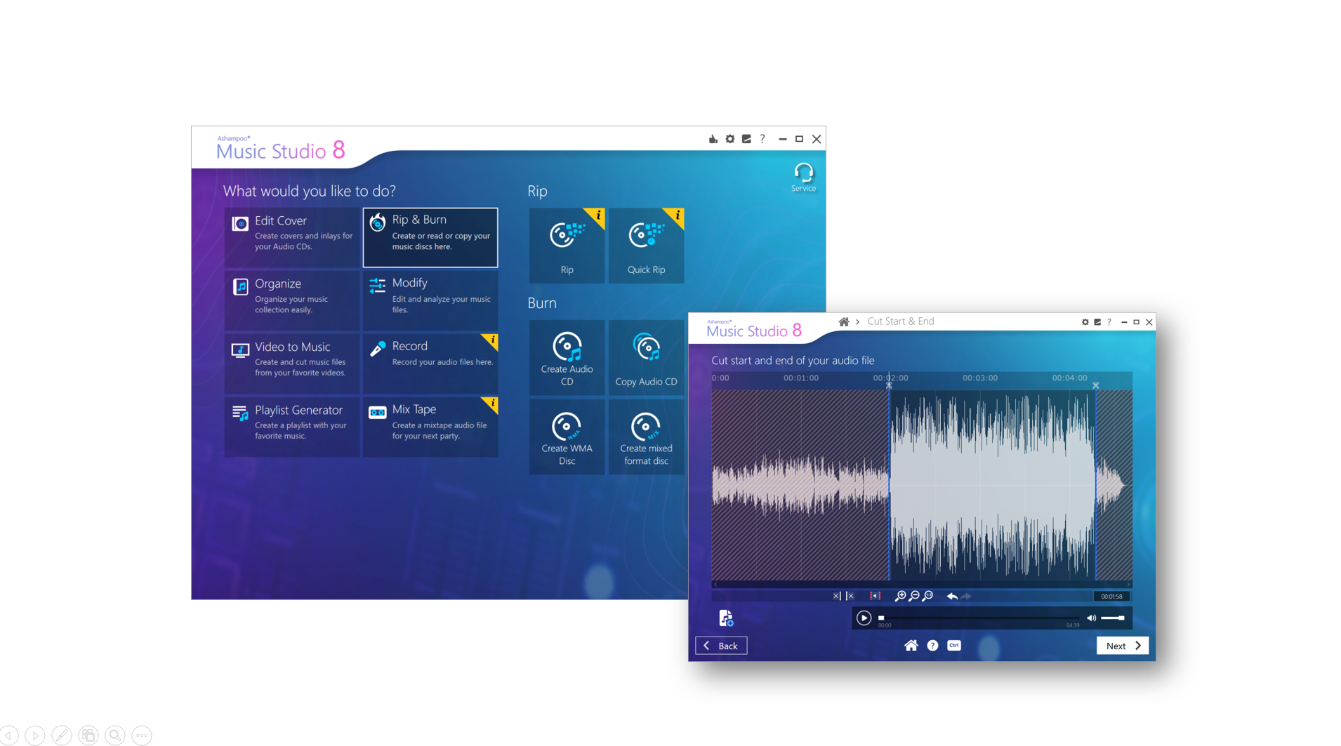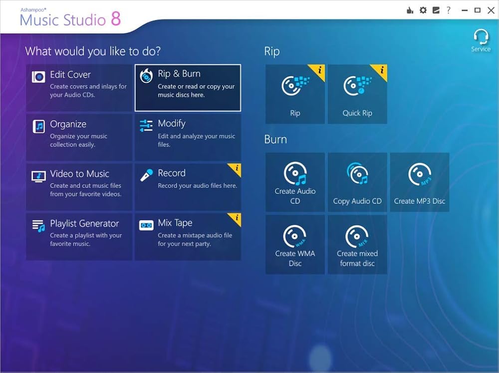 موسيقى ستوديو 8 تمزق وتحرق وتقطع وتحول وتسجل الموسيقى والملفات الصوتية. كما أنها تتميز بأدوات لتنظيم مجموعات الموسيقى وطباعة وتصميم الأغطية وأكثر من ذلك بكثير.