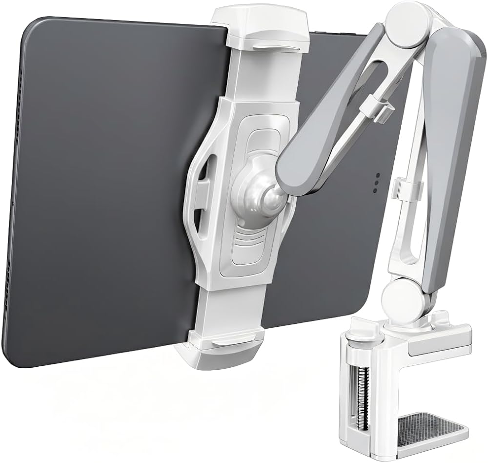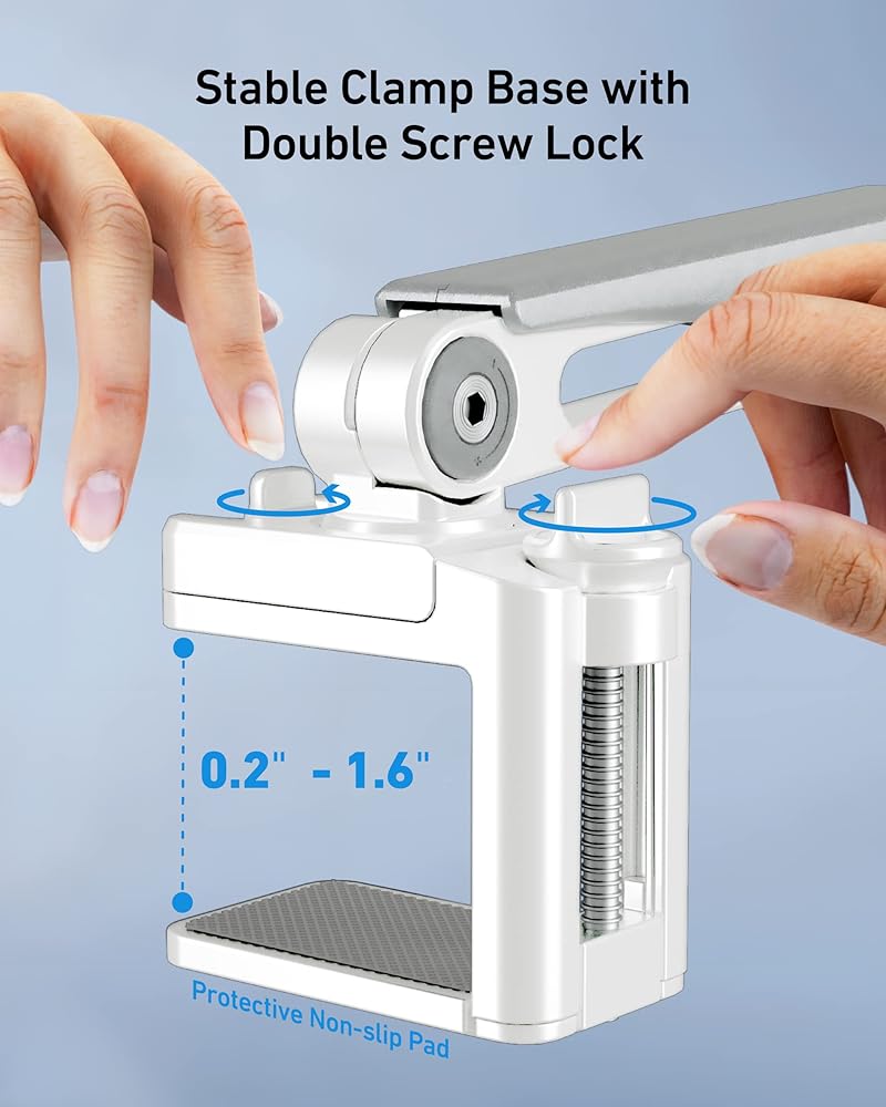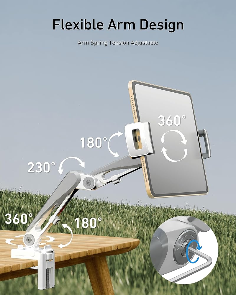 【Sturdy and Durable】This iPad holder features a strong clamp mount and high-quality materials for a secure and stable support for our devices. The reinforced base fits the countertop/headboard thickness between 0" to 3" (0 - 75 mm).