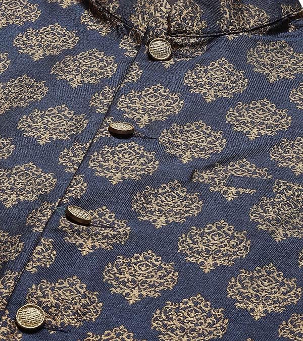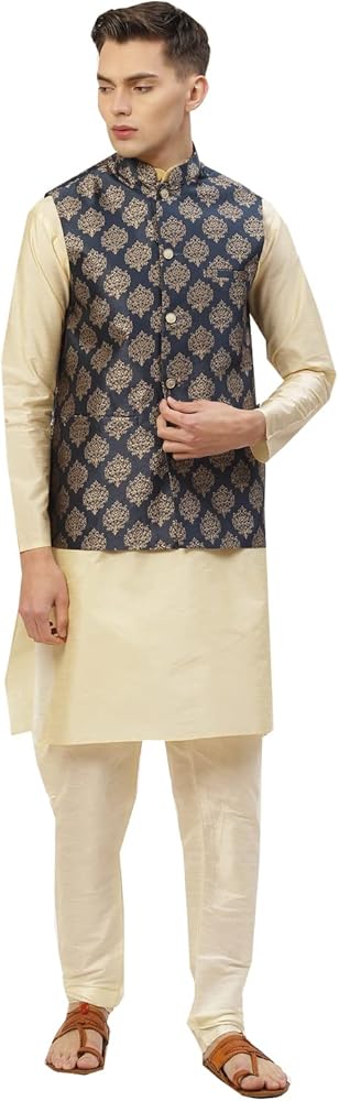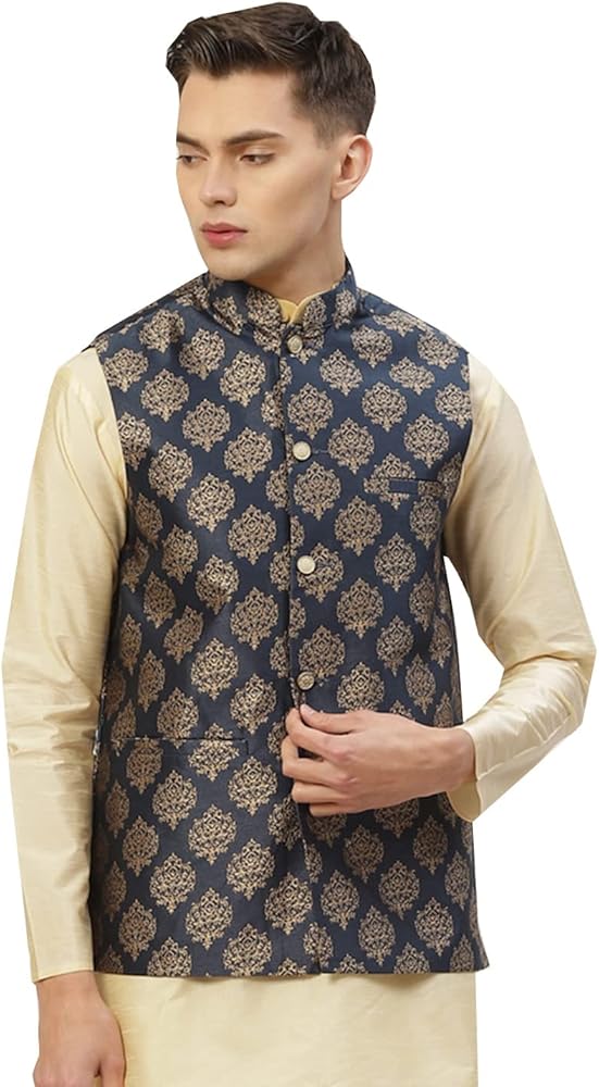 Elegant closed neck waistcoat button down also called Jacquard Nehru jacket, Indian Vest or “Band Gale Ka Coat” made of Polyester fabric by the weavers of India. Excellent gift for men, suitable for formal and casual wear. Hand wash recommended. Highly comfortable and eminently suited to all climatic conditions, its use is widespread throughout the Indian subcontinent. These outerwear vest can be worn over kurtas or any shirt.
