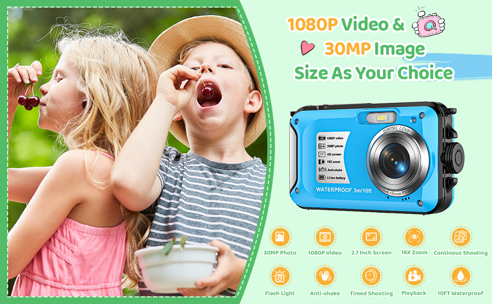 【كاميرا رقمية 1080P و30MP】تلتقط الكاميرا الرقمية المقاومة للماء مقاطع فيديو عالية الوضوح FHD 1080P وصور 30 ميجابكسل مع أحدث نظام قياس CMOS، لا حاجة لإعدادات يدوية معقدة مع تقديم صور ملونة طبيعية تلقائيًا. ثانية واحدة للضغط على الغالق، فهو سهل للمبتدئين والأطفال.