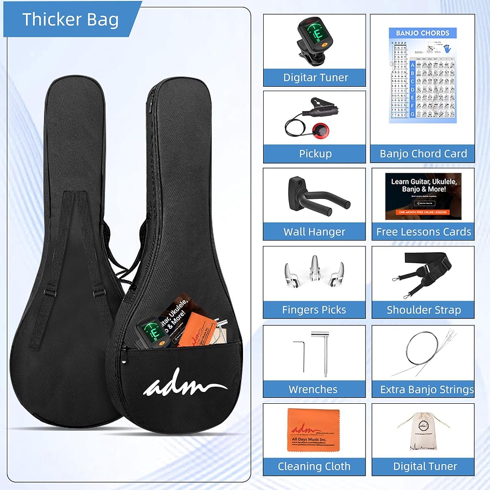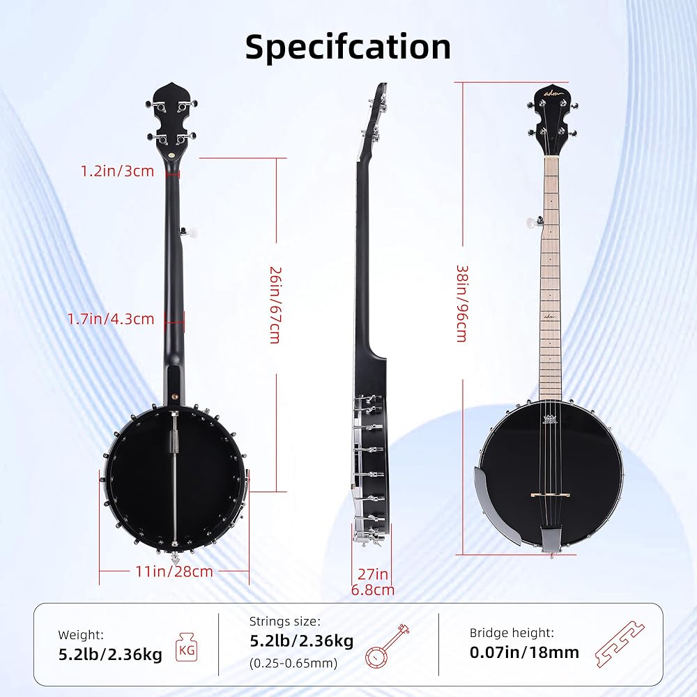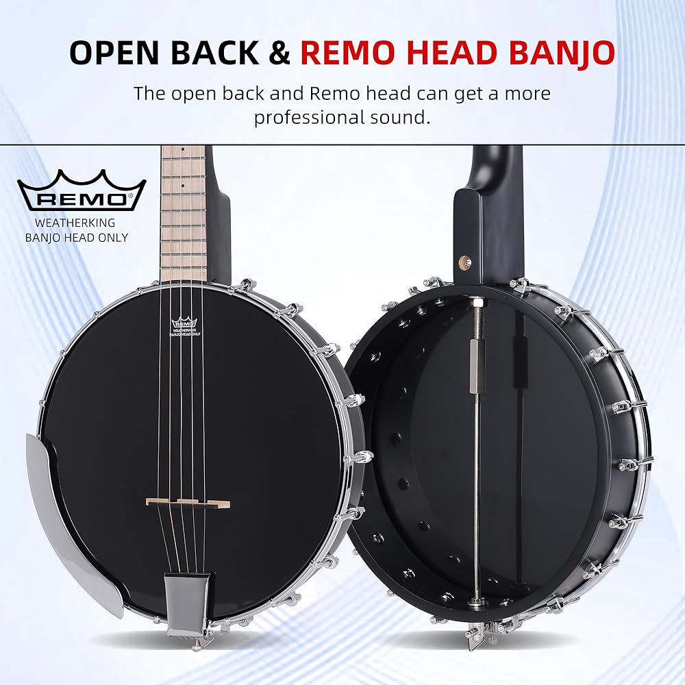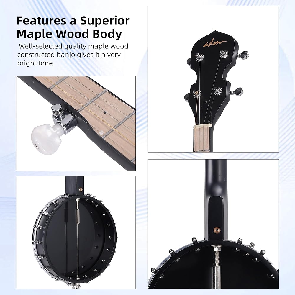 ADM 5 String Banjo Guitar Kit with Remo Drum Head and Geared 5th Tuner, 24 Bracket Beginner Banjoe Set Gift Package with Free Lessons & Starter Accessories for Adult Teens (Black-Open Back, 38 Inch)