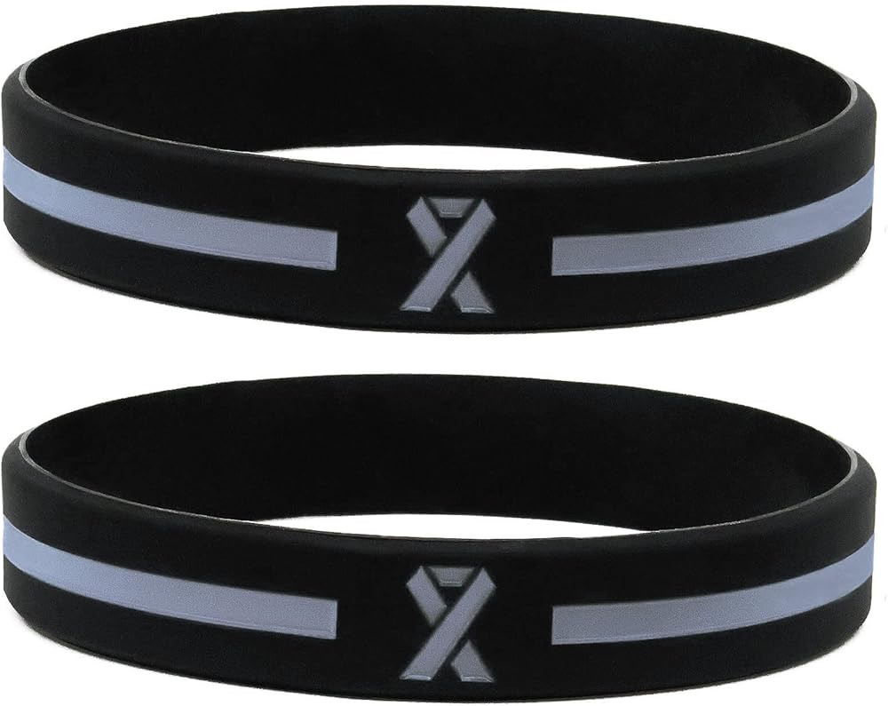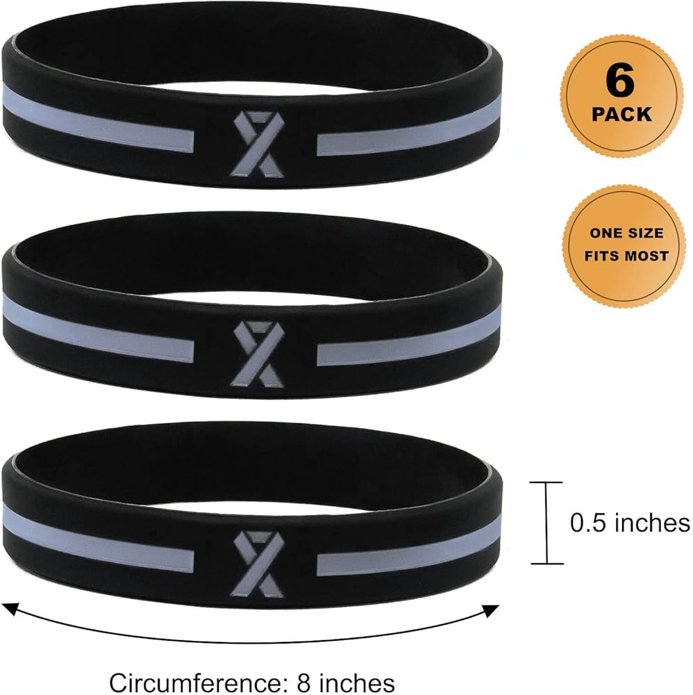 CONTENTS: 6 Silicone Rubber Wrist Bands / SIZE: 8 inches circumference x 0.5 wide x 0.1 inches thick. DESIGN: Grey Awareness Ribbon and band on black background; wraparound design with gray ribbon on front and back / MEANINGS: The gray color awareness ribbon represents a multitude of causes, including diabetes awareness, allergies awareness, Borderline Personality Disorder, aphasia awareness, brain cancer and brain tumor awareness and Parkinson's Disease. Giftphoria's gray awareness ribbon bracelets are deep-debossed with gray color for long-lasting wear. These wristbands are offered here in a multi-pack bulk bundle of 6, so you can wear them as single bracelets, stack them together, share them with friends and family, or give them away as gifts and awareness accessories. Wear them in support of your cause on your gray awareness day, and to help raise awareness in your community. These versatile bracelets are one-size-fits-most, and offer a modern alternative to lapel pins and stickers. They are so versatile and useful, and can even be converted to a wrist lanyard keychain by attaching them to any keyring. You can drop them into goodie bags and giveaway bundles, or sell them at your event as fundraising merchandise.