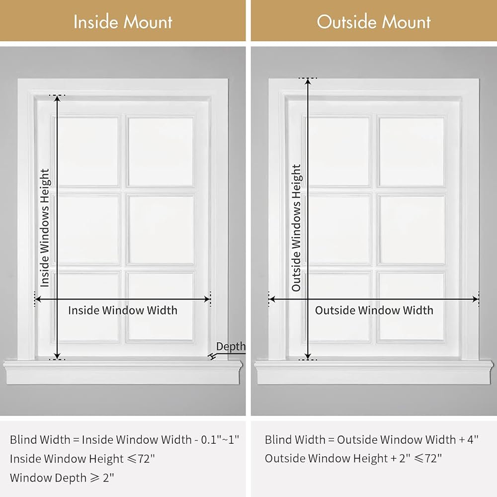 NOTE: ①Window depth need more than 2 Inches for inside mount, otherwise please choose outside mount. ②Pls just select blind wide size according to your window wide size and mounting type. It can work window height from 15" to 72". All the fabric is kept in the top rail of the blinds and you just pull it out and adjust it at any length you want.