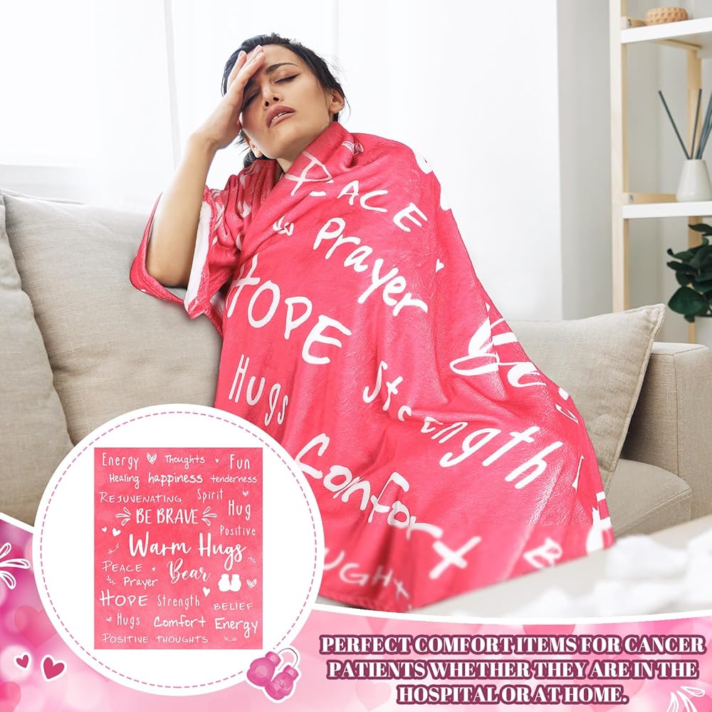The size of the breast cancer items in the set is carefully chosen to consider user convenience. With this tote bag measuring approximately 17.72 x 16.93 x 5.31 inches/ 45 x 43 x 13.5 cm, it is ideal for carrying items. Also, the comforting flannel blanket, sized approximately 60 x 50 inches/ 152 x 127 cm, is ideal for lounge time at home or hospital.