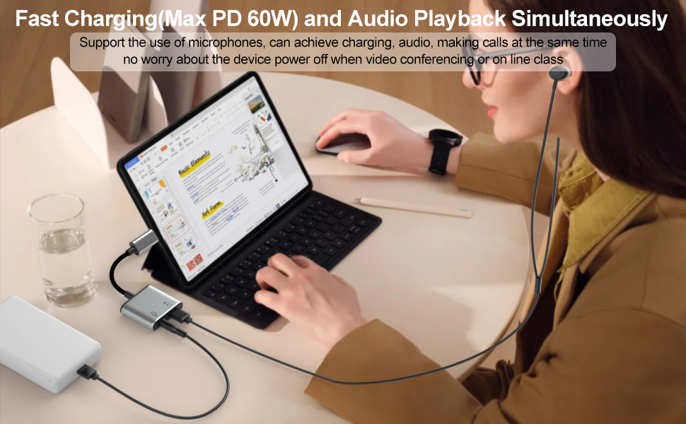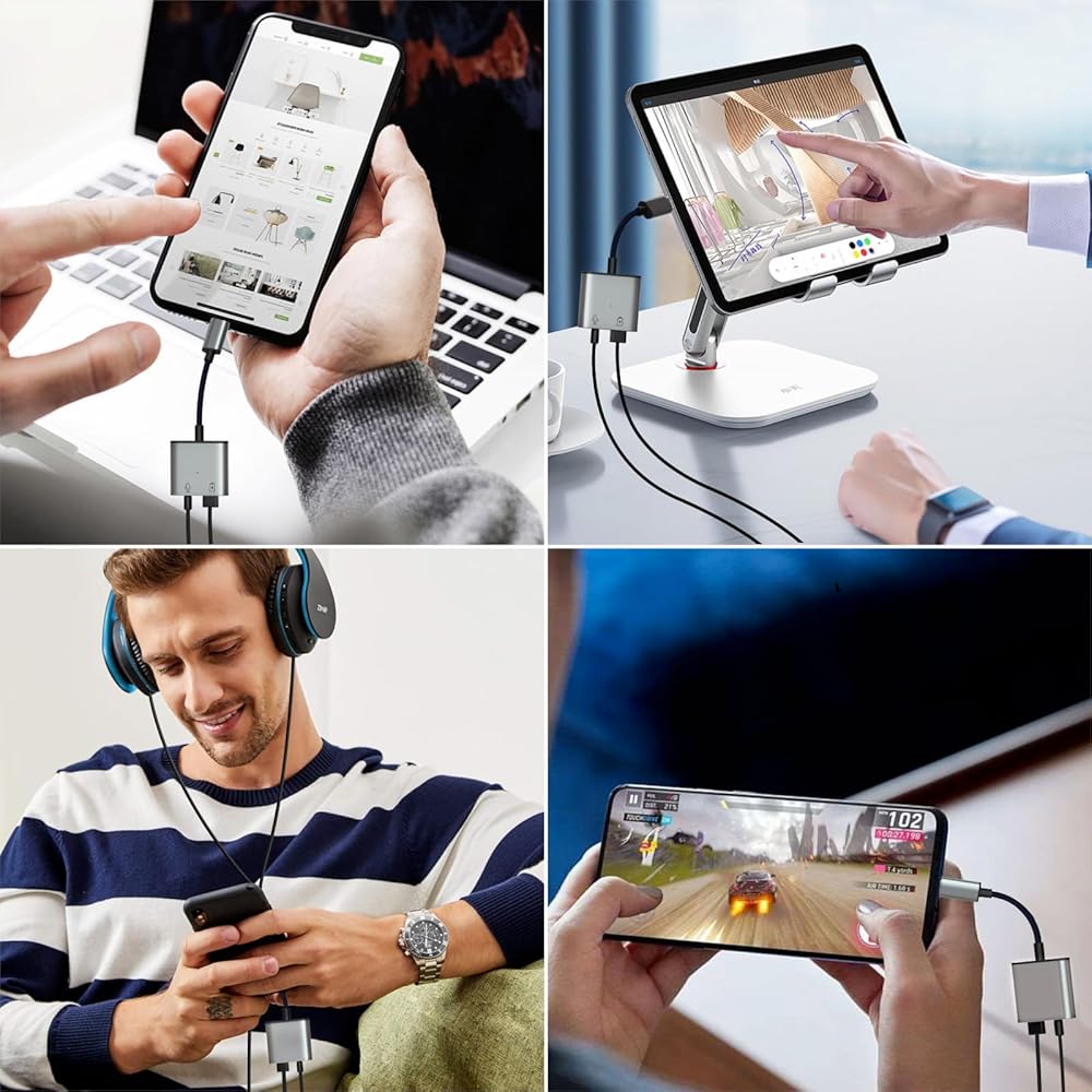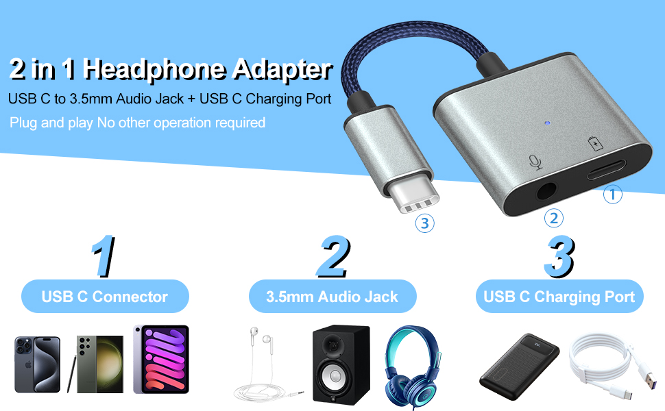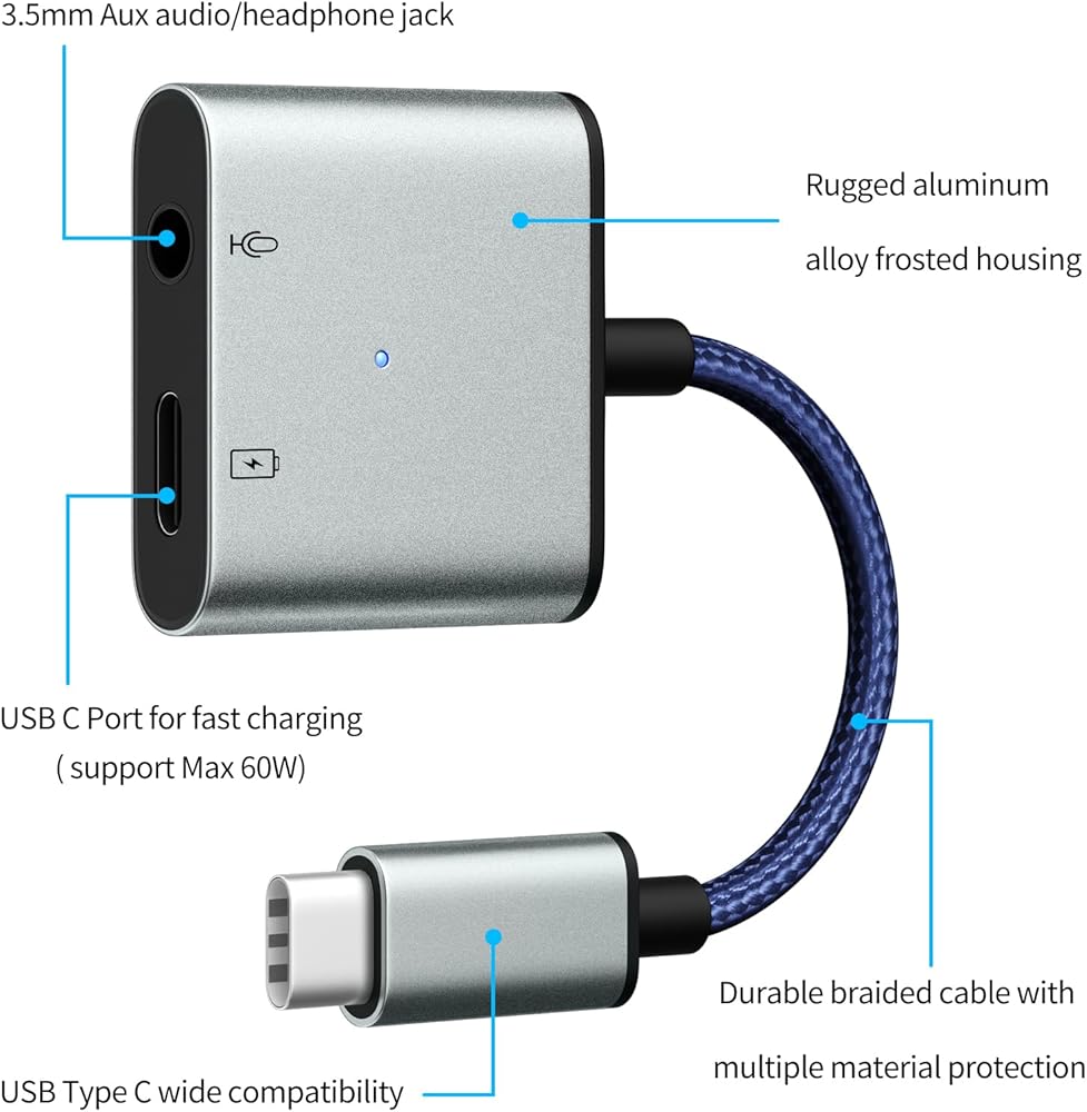 【Crystal-Clear Audio Sound】:This 2-in-1 USB C to 3.5mm adapter enables simultaneous charging and listening and is certified to support all 3.5mm headphone plugs, and the adapter built-in DAC chip delivers rich and immersive audio sound for an unprecedented high fidelity sound experience. [Note :3.5mm is an audio jack, USB C port only supports charging, not audio]